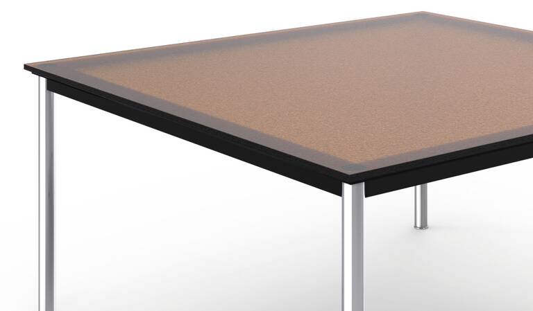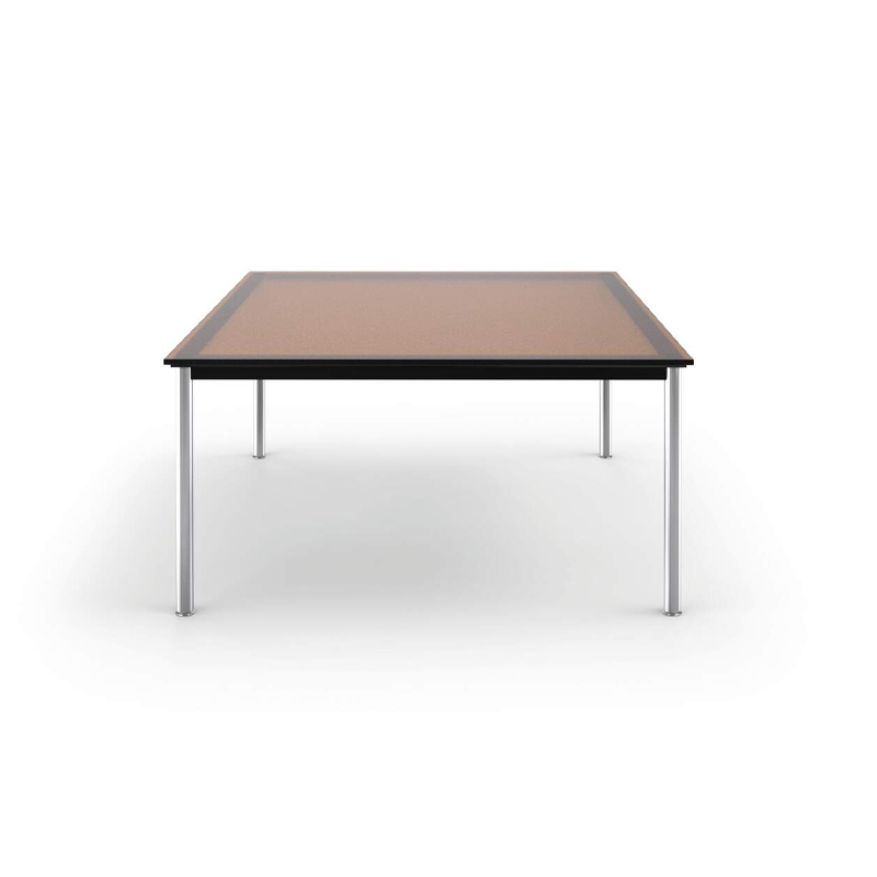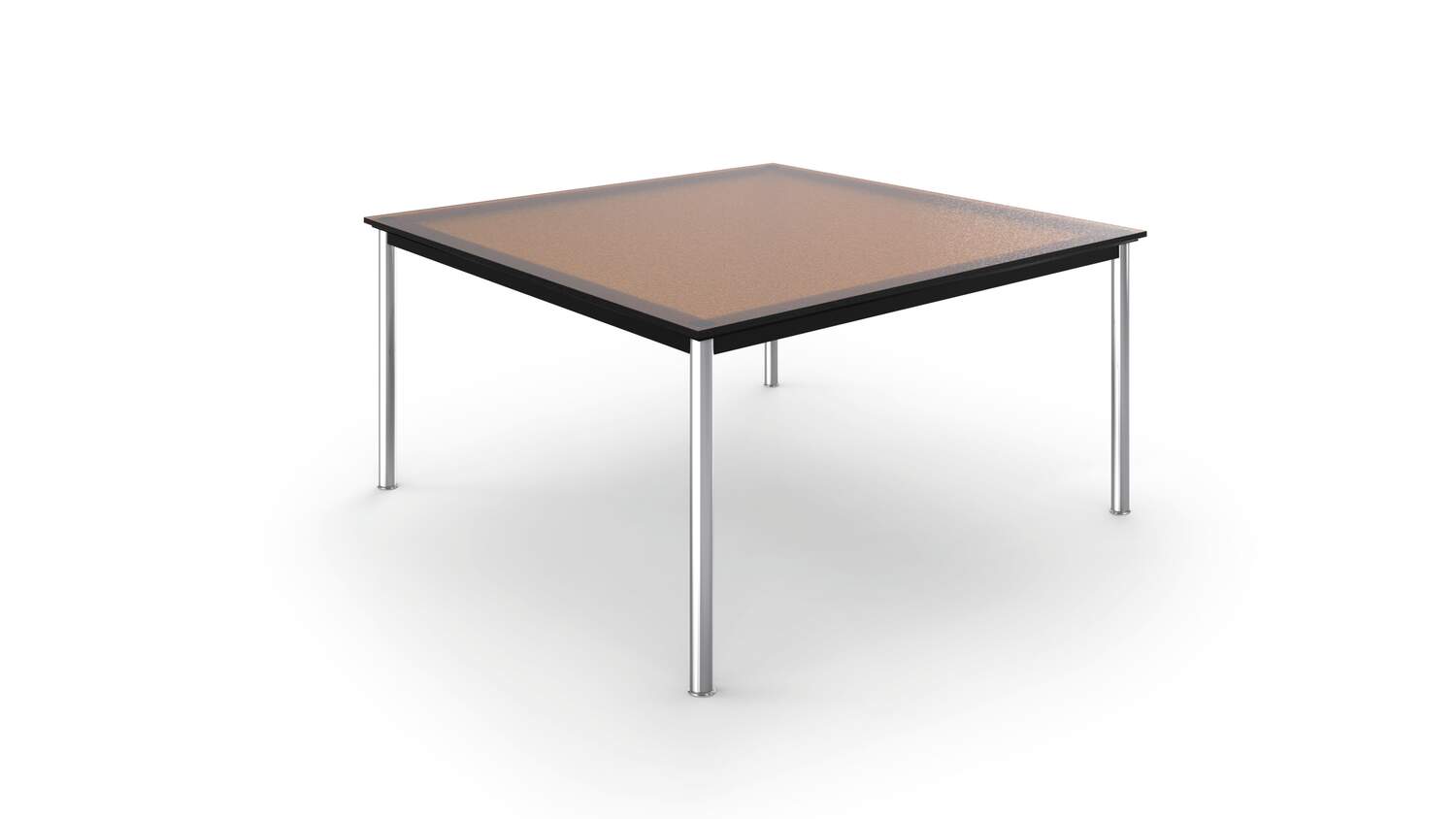 The series includes tables and low tables, in square and rectangular formats, with top in clear, textured or tinted thermoformed glass and painted trim in the various shades of the Le Corbusier colour palette.