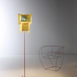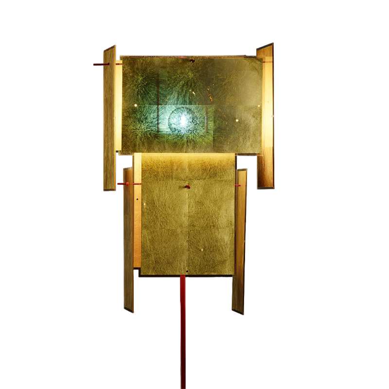 Metal, eight plates with gold leaf cast in acrylic glass. The floor lamp from the 24 carat blue family. With 200 cm red plug cable and pull switch on the socket. The shades are manufactured in Japan using a unique process in which wafer-thin gold leaf is cast into acrylic by hand.