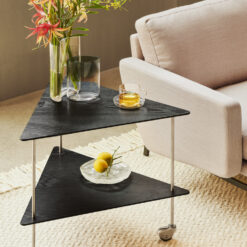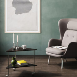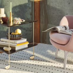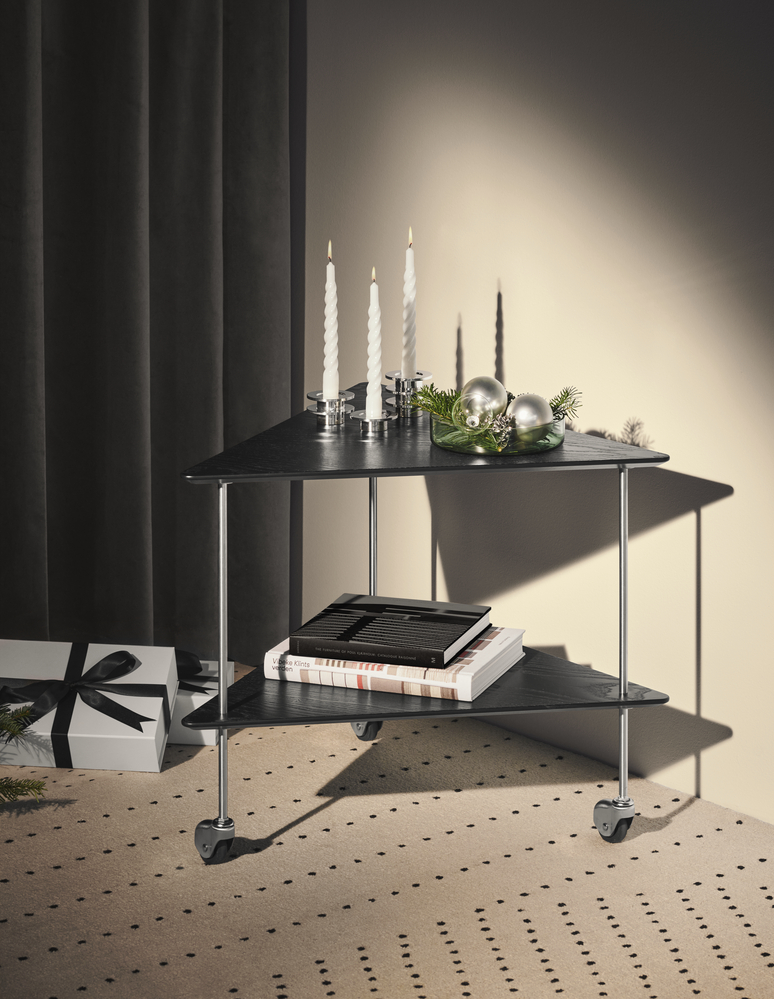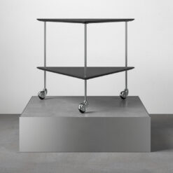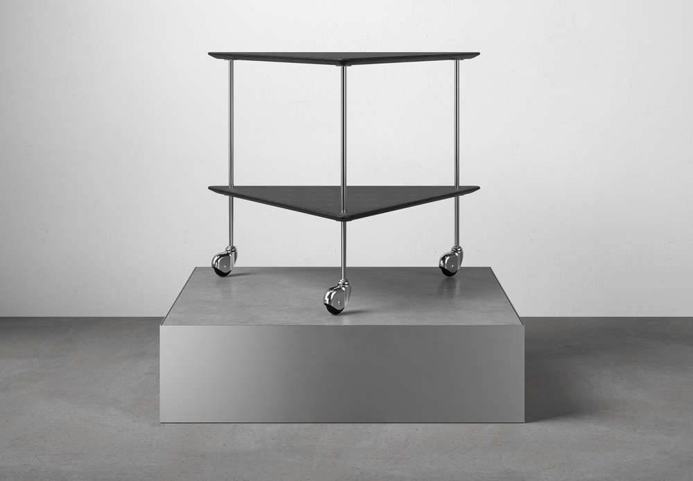 A mobile side table design with a sophisticated, architectural edge. Arne Jacobsen originally designed this elegant trolley for his tea. It has now been revived from the Fritz Hansen archive to serve as a bar cart, serving trolley or side table. This is a truly versatile and storied design.