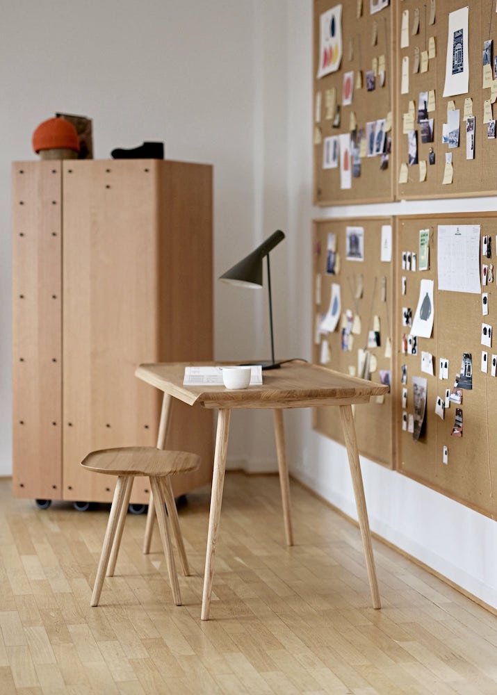 The series, which counts two stools, one side table, and a desk, is characterized by its irresistible detailing around the edges, reminiscent of a single leaf from a Water Lily. This feature strives to soften the appearance of the hard wood and give the design a living and organic shape. In order to achieve this result, wood as the sole material plays a crucial role, as artificial materials would never allow for the same degree of tactility, warmth and sensuousness.