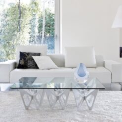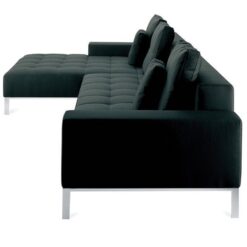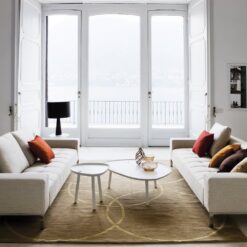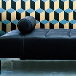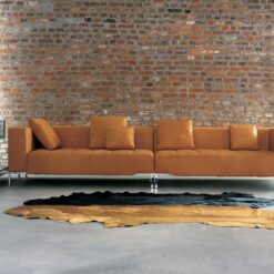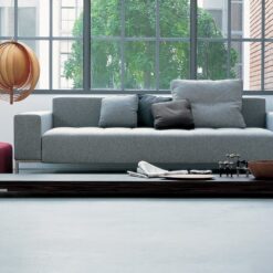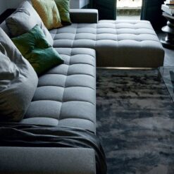 In this way, the sofa Alfa (one of the first, well-measured designs by Francesca Zanotta for Emaf Progetti) becomes the omega of a sophisticated, bourgeois and updated taste, which, against a simplification of lines, does not give up the idea of comfort, the promise of wellbeing made by the most traditional of textile surfaces, i.e. deep-buttoned upholstery, showing that peculiar motif of stitching, which here is restricted and almost only evoked in the sitting elements, while the stock of several pillows, of different sizes, to be freely added to the base of the sofa, helps to convey the feeling of a soft and protective ‘shelter’.