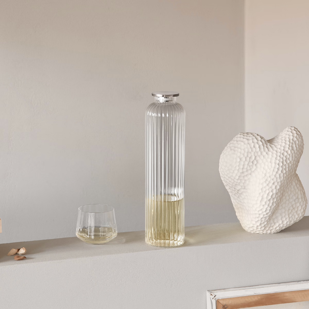 The classic elegance of this hand-blown crystal glass Bernadotte carafe makes it perfect for serving water or fruit juice. The narrow shape means it will sit easily in the door of a fridge keeping the contents chilled and the distinctive ridged surface is not only decorative but allows a firm grip.