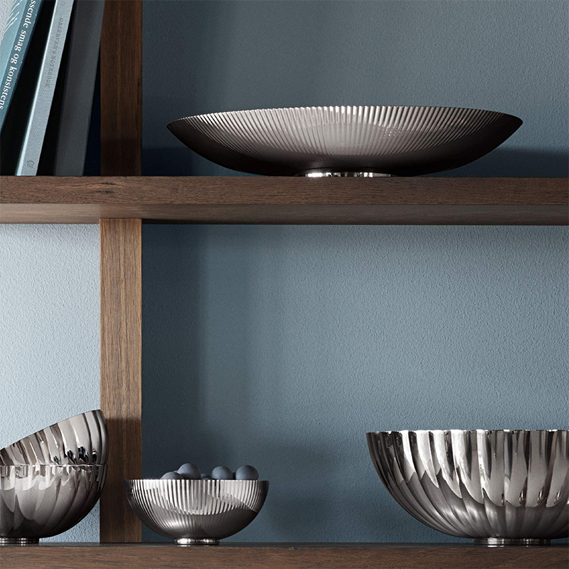 With the signature grooves of Sigvard Bernadotte’s work radiating out across its surface, this beautifully crafted low decorative bowl has a sculptural quality that is totally contemporary. Fill with fruit or flowers or leave empty as a striking centrepiece to the table.