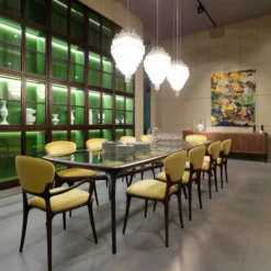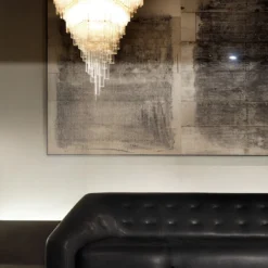 In collaboration with the DRIFT studio, Ceccotti Collezioni experiments with new manufacturing techniques, adopting an advanced production process. The aim is to create a design with strong architectural and emotional impact. Conceived in 2012, Blass is a striking pendant light. The structure, in polished brass, is quite complex. Five hundred Pyrex tubes (20 mm diameter) form a cascade. These are attached to a stainless steel frame which is laser cut and then brass plated. The result is an object that harmoniously lights up the room, encouraging you to look upwards.