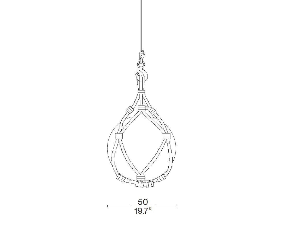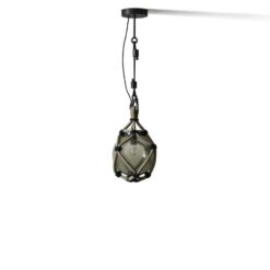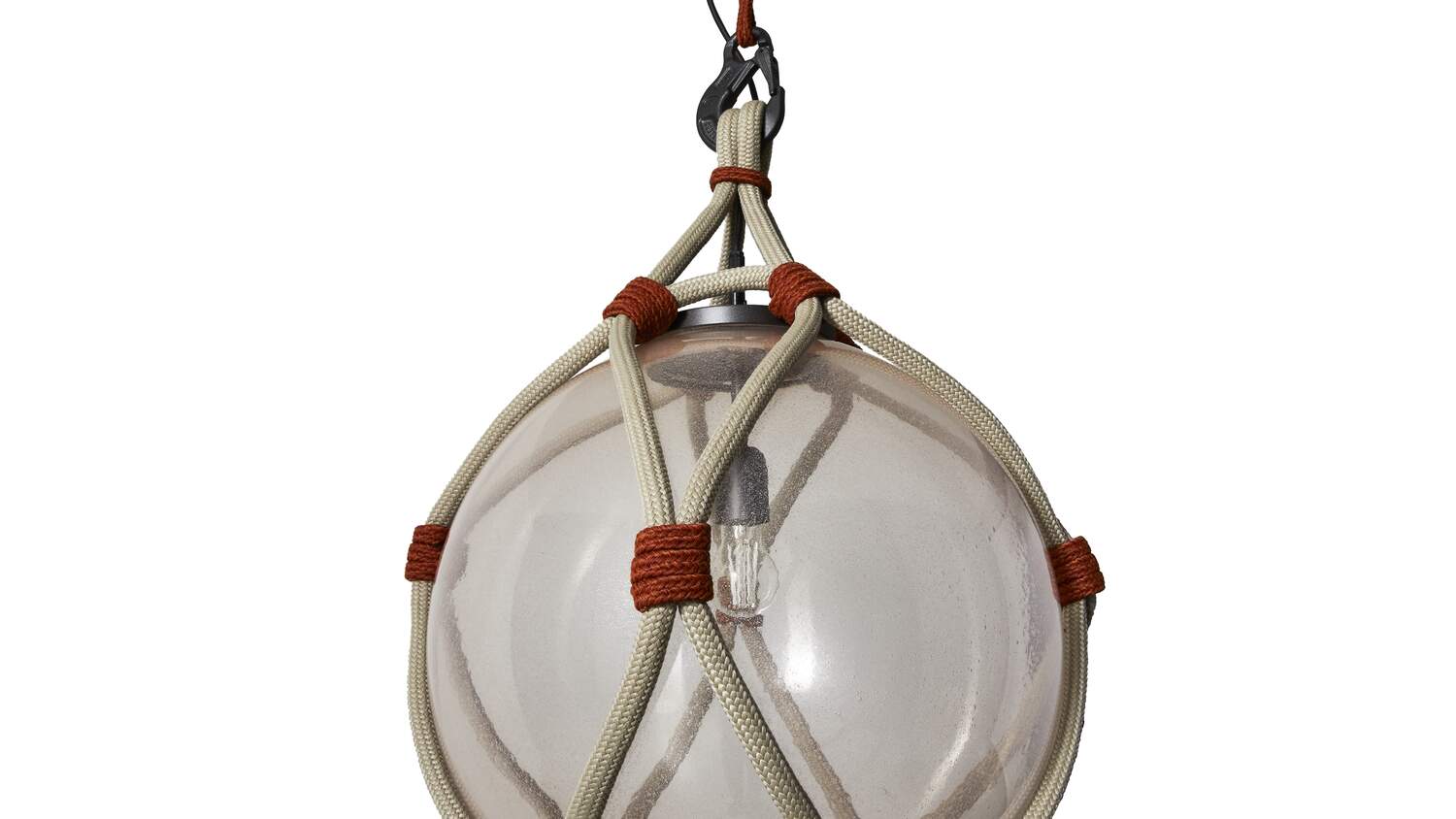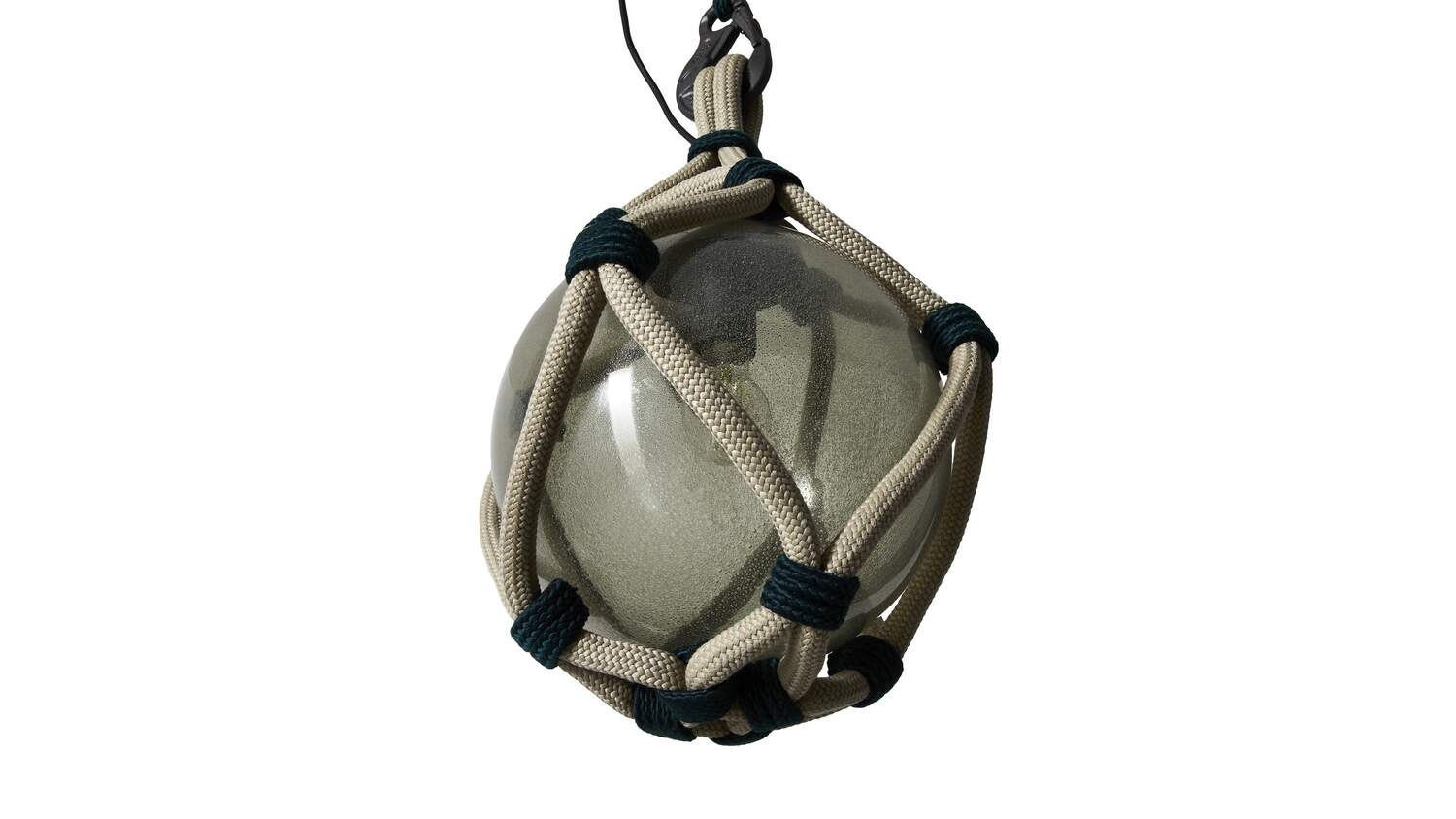 Bollicosa Nautilus has the same blown glass sphere as the Bollicosa indoor with the distinctive bubbly surface caused by the artisan blowing process; the natural irregularities make the material rough and matt and imbue it with a 3D quality that gives it the appearance of a fossilized stone to the naked eye. The outdoor version envelopes the diffuser with a neutral-coloured polypropylene cord net, with knots in contrasting colors, which recalls the hand weaves of the furniture in the Cassina outdoor collection. In two sizes, ∅ 30 cm or ∅ 50 cm, with fumé transparent glass with green knots, or pink with rust-coloured knots.