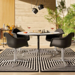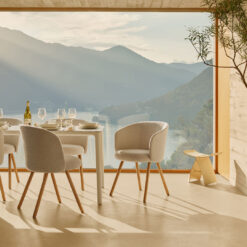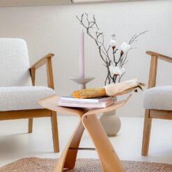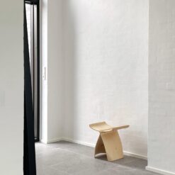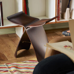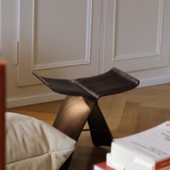 The gently curving silhouette of the twin seat shells is reminiscent of a butterfly’s wings – eternally poised for flight. The stool is made of maple or palisander wood.