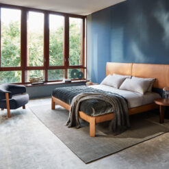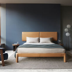 The bed designed by Mario Bellini is distinguished by the structure and legs covered in a warm and precious leather, which is enriched with the saddle stitching visible in the joints between each part. The slightly tapered and padded headboard, defined by central stitching, is upholstered in fine leather and hide, which is treated with a special tanning that makes it particularly soft and comfortable. The advanced workmanship of thick, full-bodied materials reveals Cassina’s experienced craftmanship and the exceptional mastery perfected from the creation of the Cab chair. The different leather parts, cut using a numerical control machine, are then manually processed to make this piece a true masterpiece of manufacture. The bed is available in the version with traditional headboard or fixed to the wall, ideal for contract furnishings.
