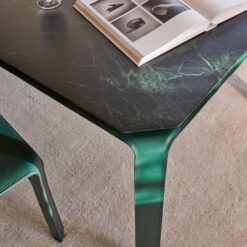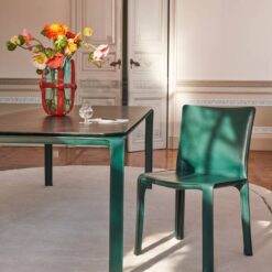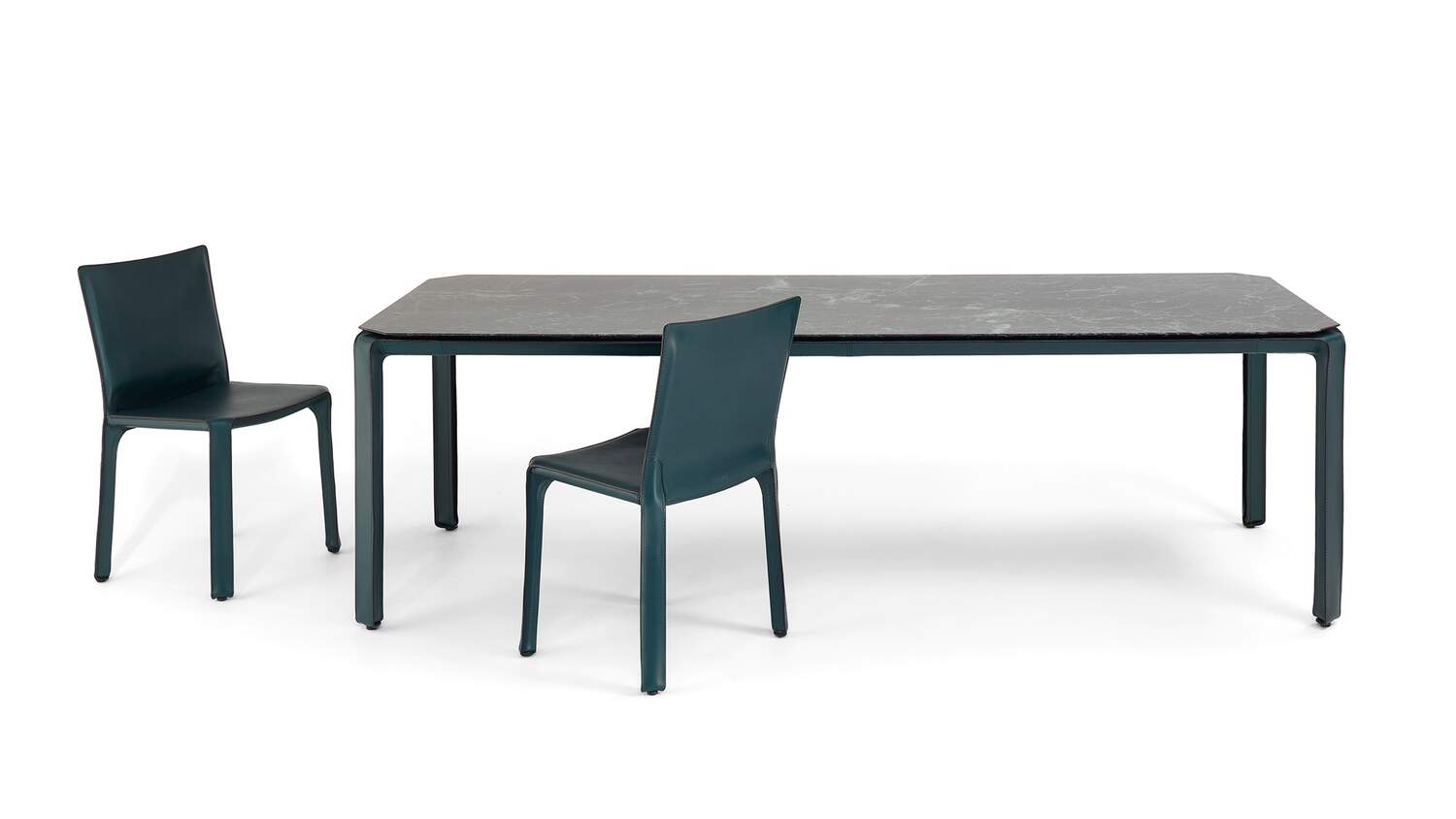 The design approach that in 1977 led Mario Bellini and Cassina to clad the structure of a chair in saddle leather – in the manner of a bespoke suit, breathing life into the iconic Cab – prompted the great architect and the Meda-based company to extend the same aesthetic language to the creation of an elegant, sophisticated table. Cab Tab highlights the expertise of the company’s artisans in the lengthy, intricate processing of saddle leather. The various parts, cut with a CNC machine and then worked by hand, are sewn to create a piece of upholstery that is masterfully hand-moulded to the metal skeleton of the table. The table is embellished with saddlery top-stitching visible in the junctures between the parts. The upholstery is closed with zippers along the inside of each leg, like a custom-made suit.