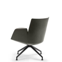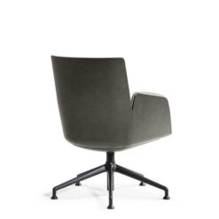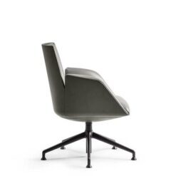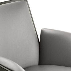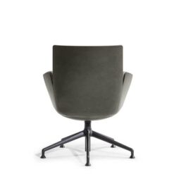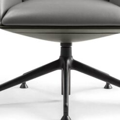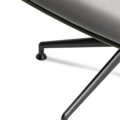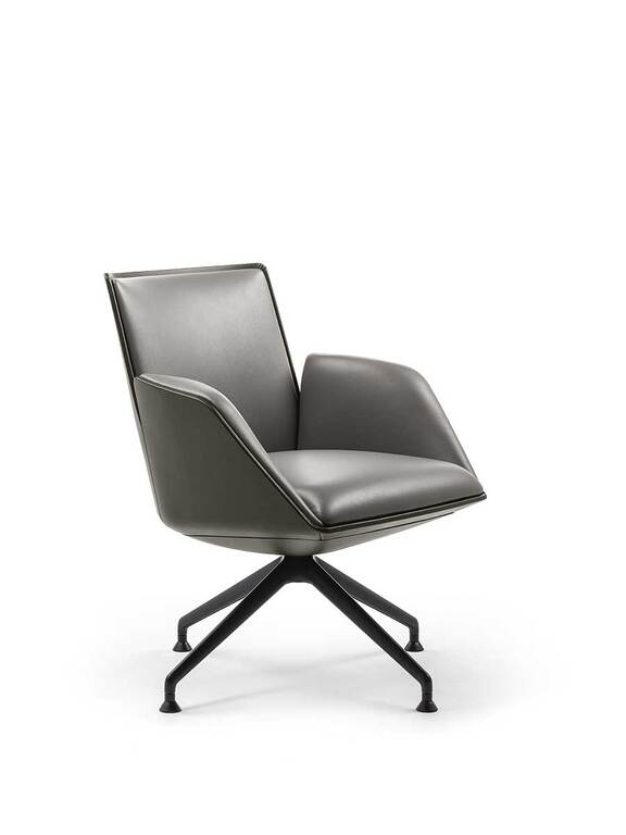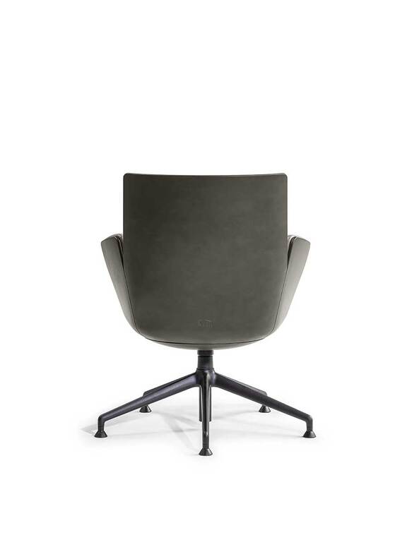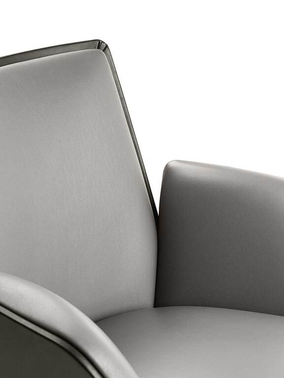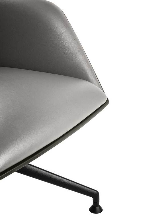 In the Cercle office chair, ergonomic design is particularly refined. The synchronized mechanism is integrated into the monocoque and further optimized by Poltrona Frau for top comfort performance. The frame is made of polyurethane with a metal insert. The padding is made of polyurethane foam with differentiated density for enhanced comfort areas and quilted with polyester wadding. The polished or black-painted aluminum base has four spokes with swivel glides made of thermoplastic material and a protective Teflon tip. The Cercle office chair features a “return” mechanism that allows the chair to rotate and return to its original position via a thrust bearing. It can be fully upholstered in Pelle Frau® or in a version combining leather on the shell with fabric on the inner surface.