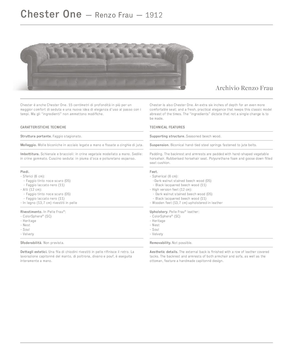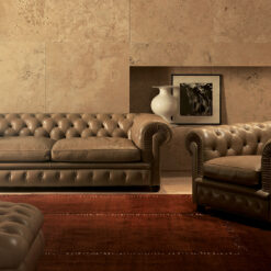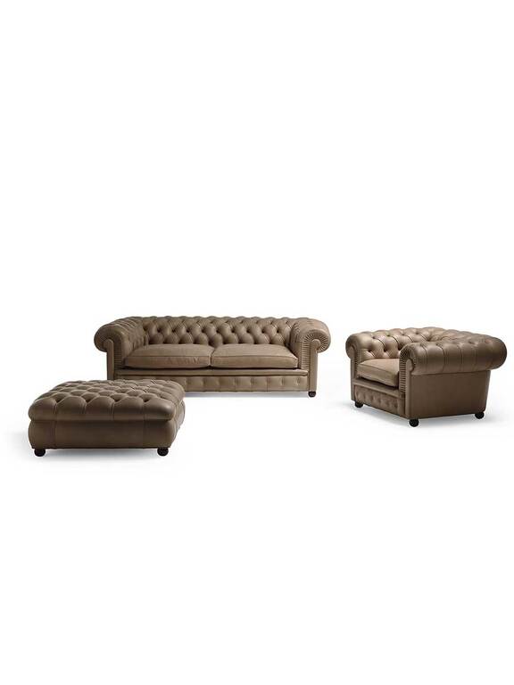 Chester is now also Chester One: a more extensive collection with new four- and five-seater sofas and poufs, also revisited in terms of their dimensions. In fact, the seats are now 15 centimetres deeper to offer greater comfort and contemporary elegance, in keeping with the times. However, the Chester One sofa maintains the features of the classic model designed by Renzo Frau: the famous capitonné processing, the curved armrest, the series of pins that refines the Pelle Frau® leather upholstery.