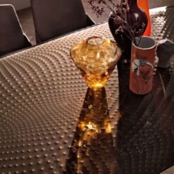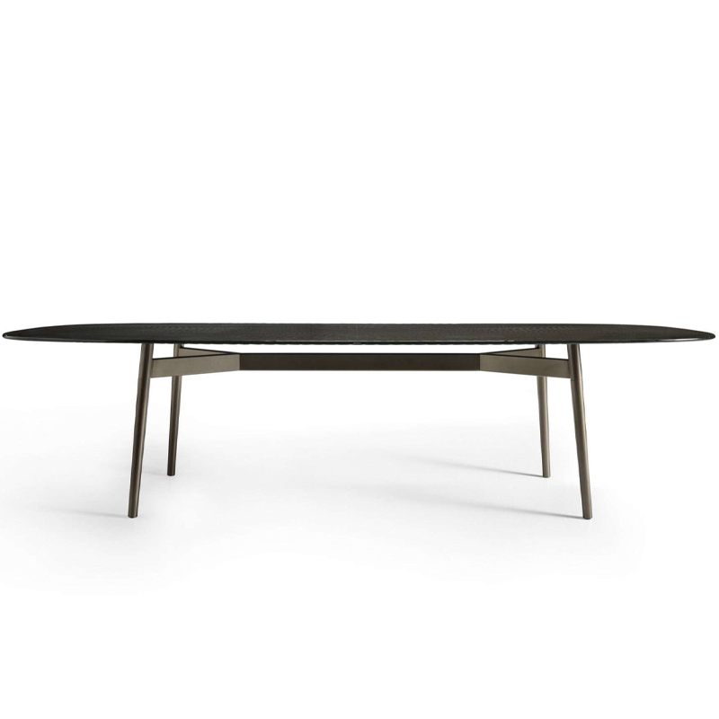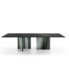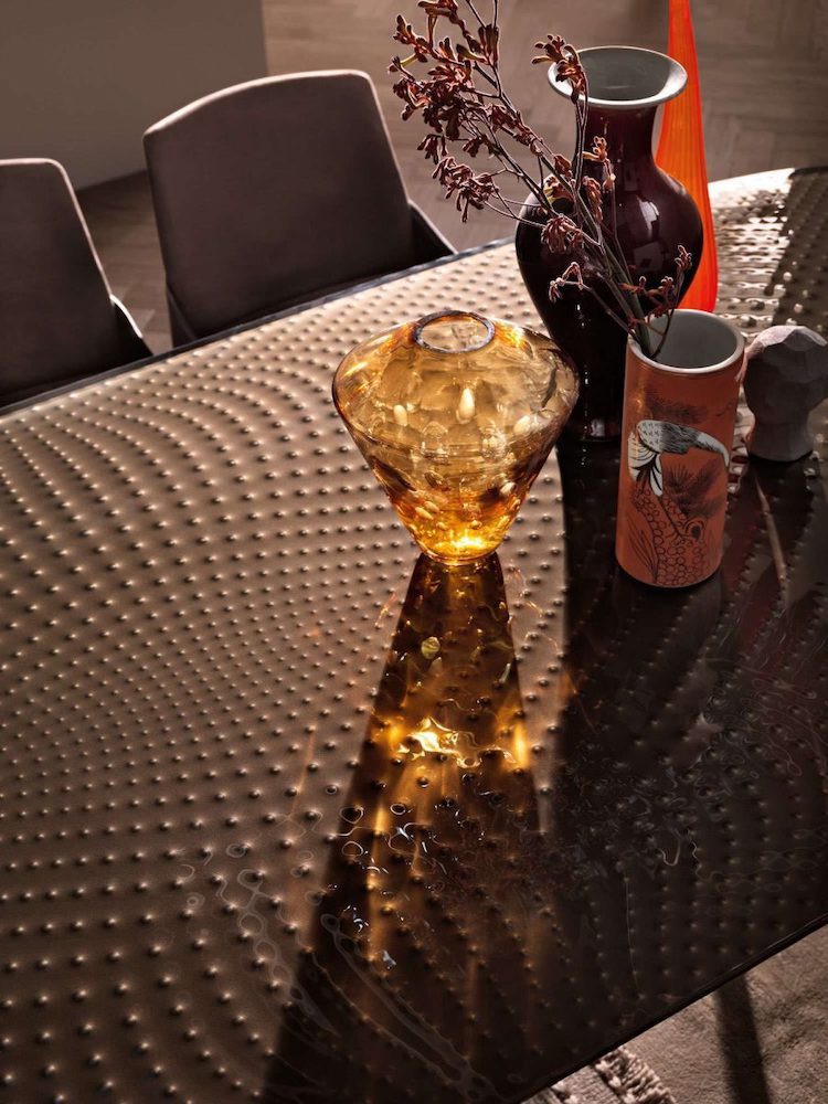 Table with painted metal base, Lava Grey oe Metallic Greige finish. Top in 15 mm fused and tempered glass, available transparent or back-lacquered with metallic paints.