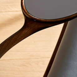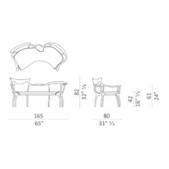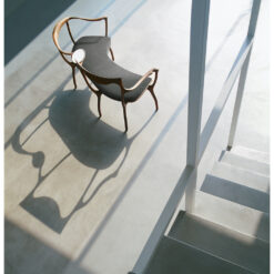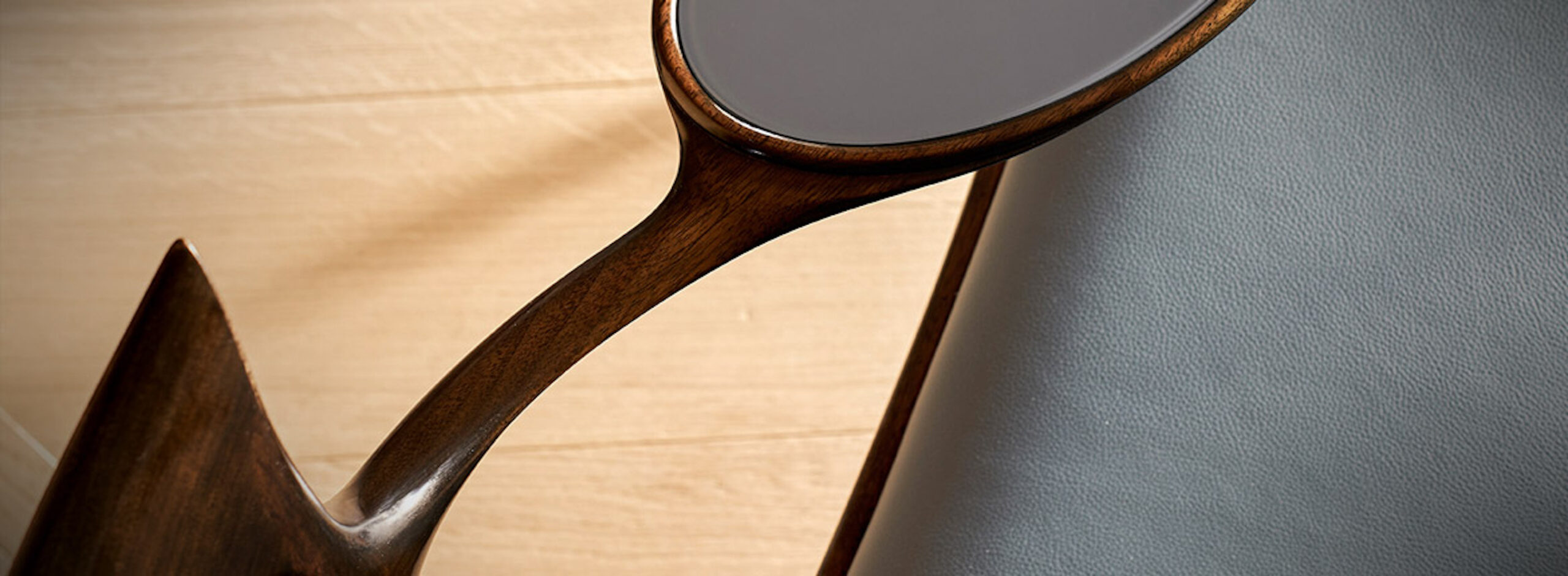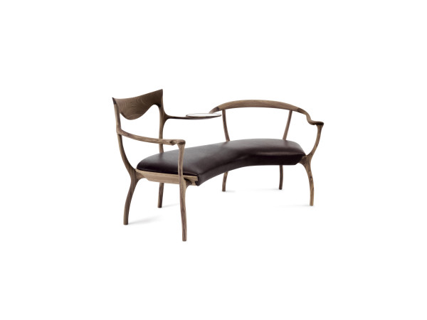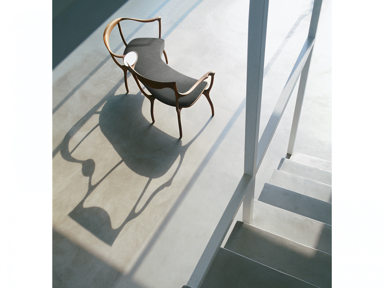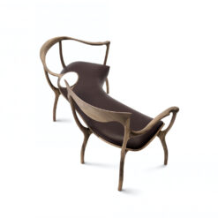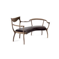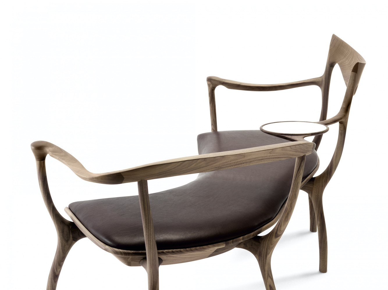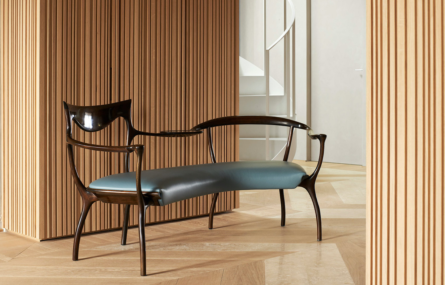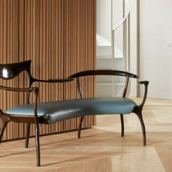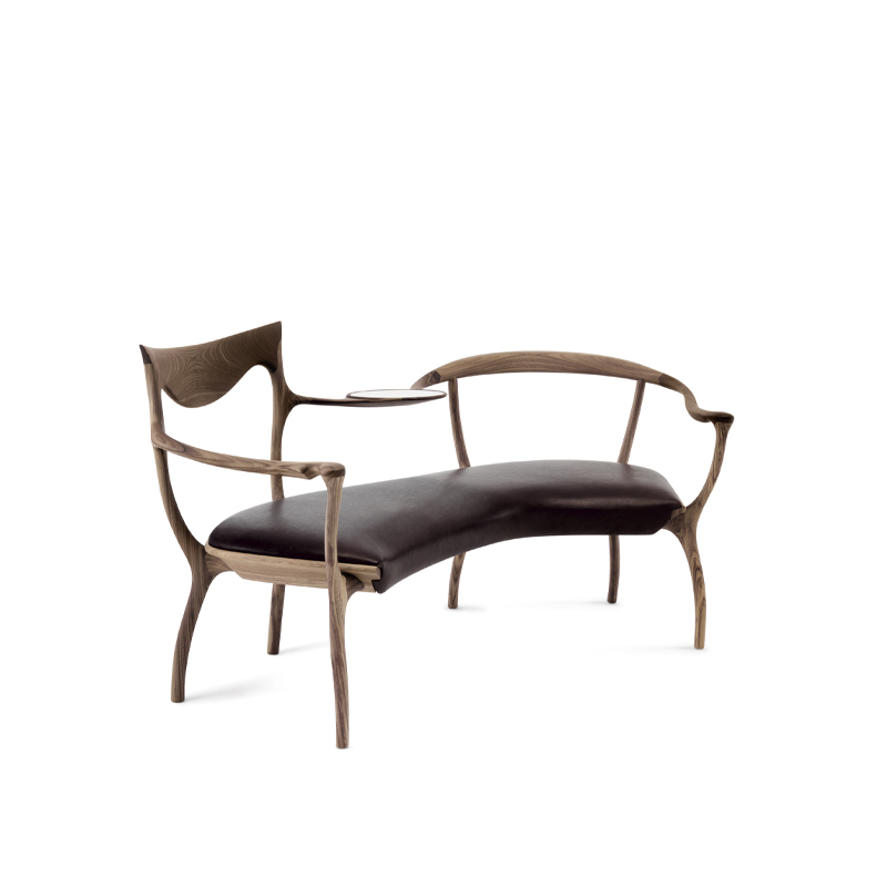 One of Ceccotti Collezioni’s most iconic pieces is the D.R.D.P. This stands for “double rêve du primetemps” – double dream of spring – the title of a painting by De Chirico, which designer Roberto Lazzeroni found powerfully evocative. This small sofa seems to fuse the surreal images of Salvador Dalì with the leaping forms of Art Nouveau, imaginatively reworked by the designer in 1989 in a contemporary key. The idea was to create a comfortable piece of furniture with only minimal padding. The cutaway design slants dramatically, with fluid forms that seem almost to float, as if they are held together only by the tray of silver-finished sandblasted glass at the centre. The design and techniques used to produce the base of the sofa are highly complex. D.R.D.P. is reminiscent of the organic silhouette of a plant and of sculptural forms, and it is supported by a series of slim, minimalist legs in solid American walnut. The overall effect is one of extreme lightness, and it is evident that the Hypnos armchair inspired this design.