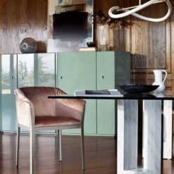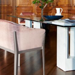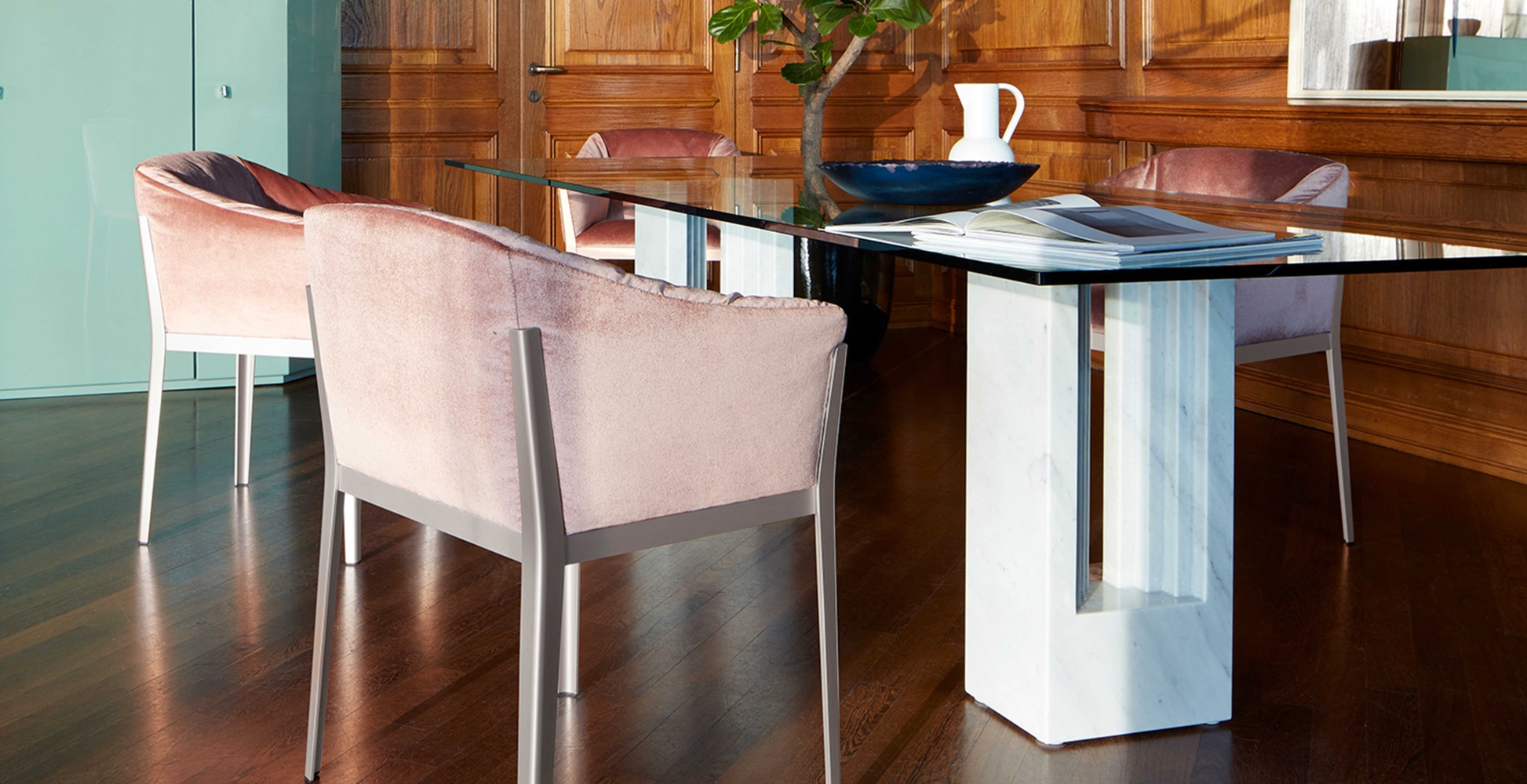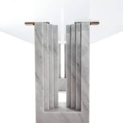 Delfi forms part of the Ultrarazionale collection, which was launched in 1968, and is composed of sculptural pieces designed by Carlo Scarpa, typified by his signature attention to detail and choice of materials. This table is a re-design of a Rationalist model created by Marcel Breuer in the 1930s for Dino Gavina’s residence in Bologna. At the end of the 1960s, Scarpa began to re-examine the original concept, effecting some variations, in agreement with the designer. In 2009, Tobia Scarpa, Carlo Scarpa’s son, suggested yet another variation: this time, a glass table-top so as to highlight the elegant brass supports and the floating on the marble bases, the better to see the formal elegance of the piece.