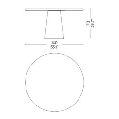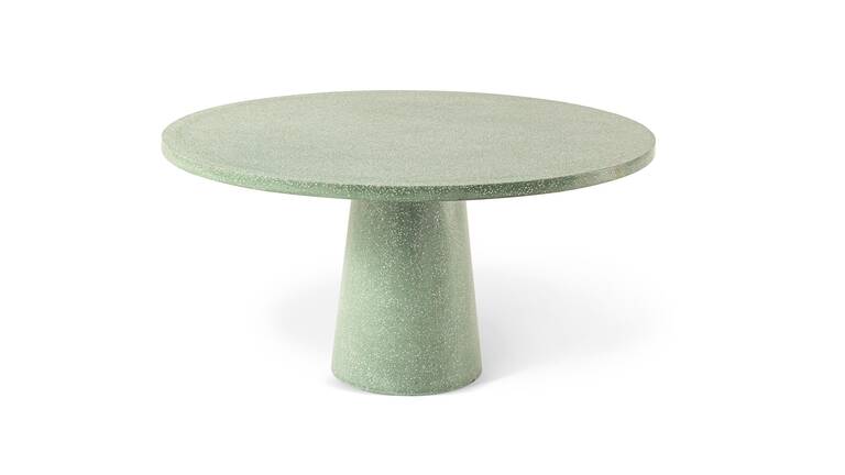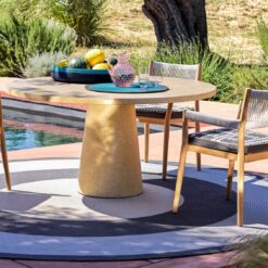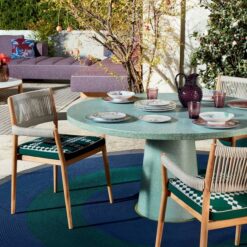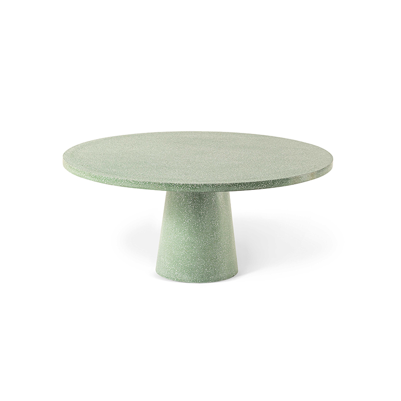Sophisticated style is the hallmark feature of the Dine Out family of tables. The round table is made up of a single conical base in concrete with concrete top, or with base in yellow-white or green-white terrazzo with top in the same material. A contrasting teak table top is available for all the bases. In addition to the original base with two conical elements in concrete, yellow-white terrazzo or green-white terrazzo, the rectangular table is also available with four teak trestle-style legs. The top is always in solid teak. Dine Out expands with a new version inspired by the concept of informal dining, perfect for a poolside aperitif or a casual lunch in the garden. The tables also come with raised adjustable feet that allow them to be positioned more easily outdoors.