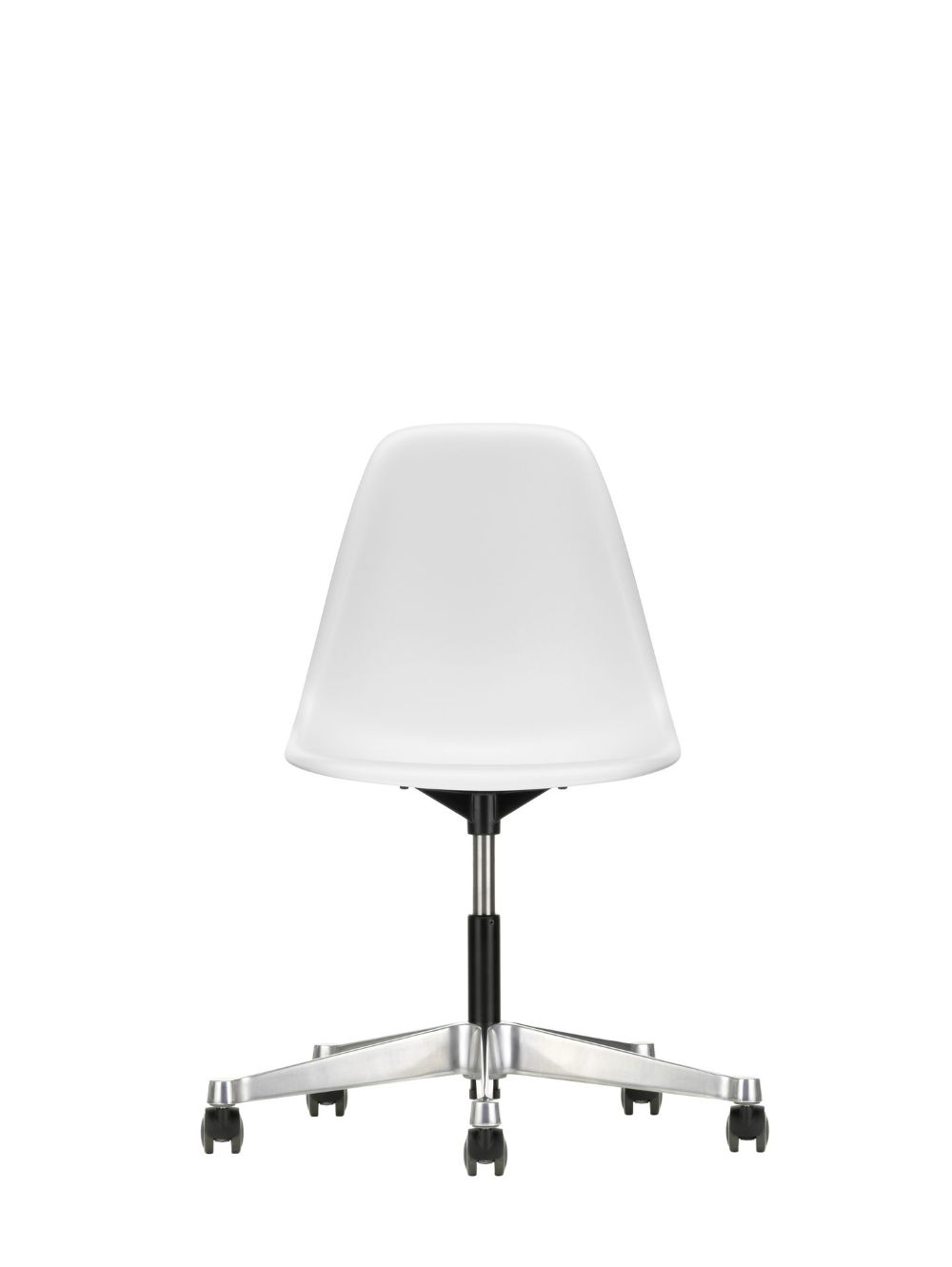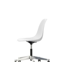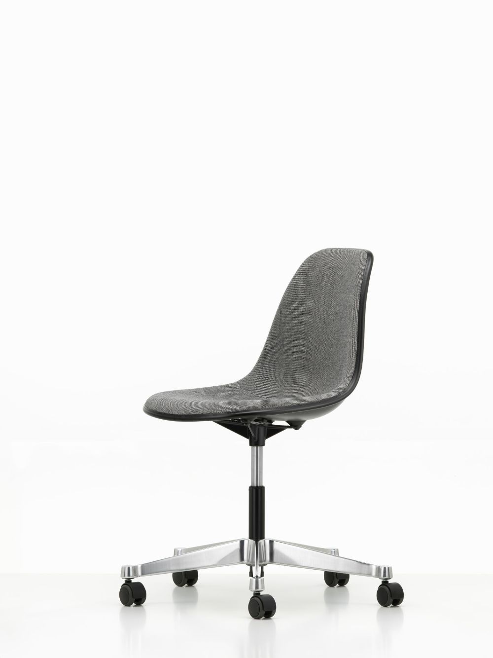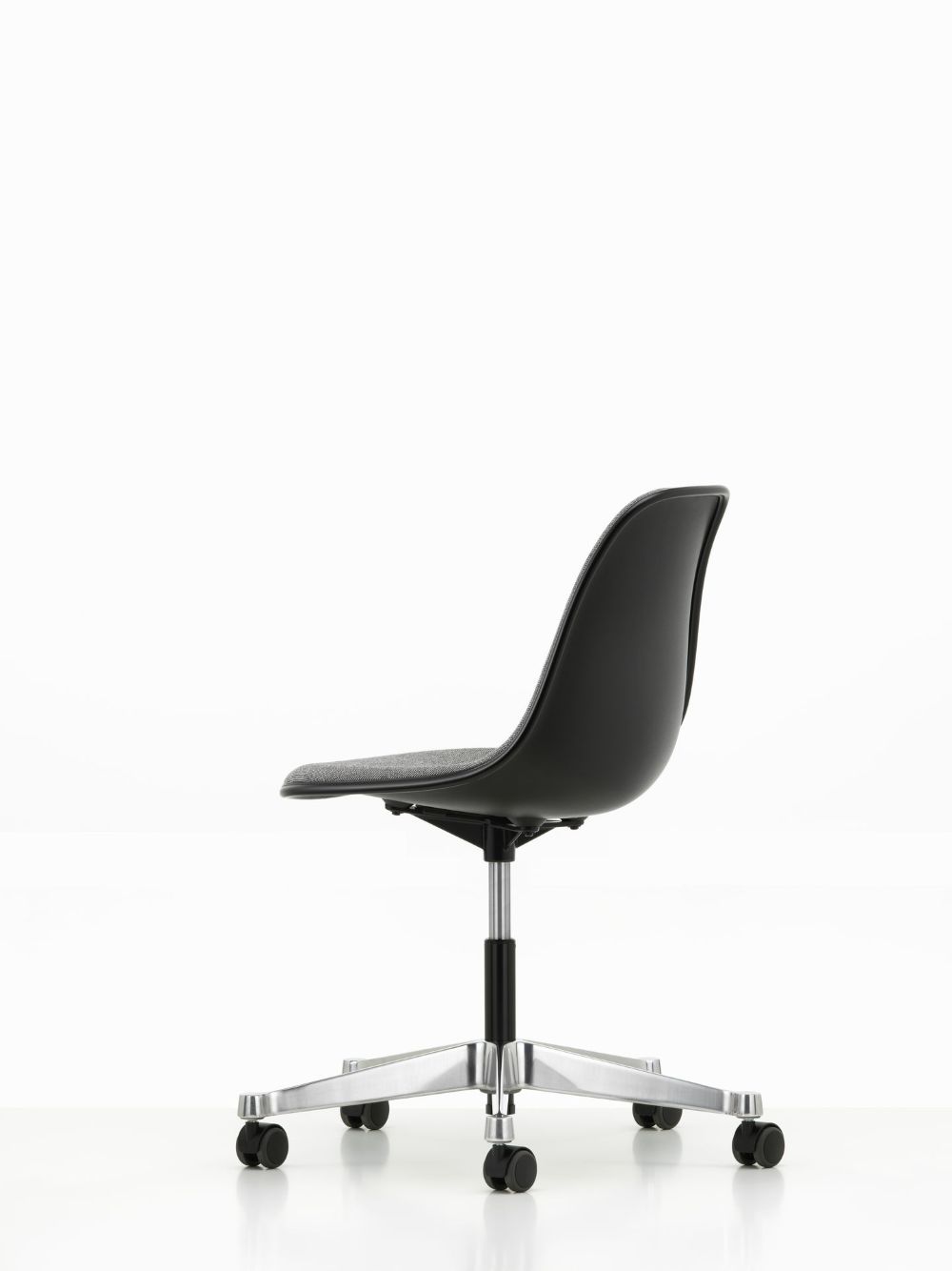 The varied selection of bases for the Plastic Chairs RE by Charles and Ray Eames makes it easy to find the right model for a wide range of locations and situations. For instance, the Pivot Side Chair Cast Base on Castors (PSCC) is ideal for informal workspaces, studios and home offices. Thanks to the swivel-mounted seat shell made of post-consumer recycled plastic, with shock-absorbing suspension and continuous height adjustment, the chair ensures superb comfort that can be further enhanced by an optional seat cushion or full upholstery.