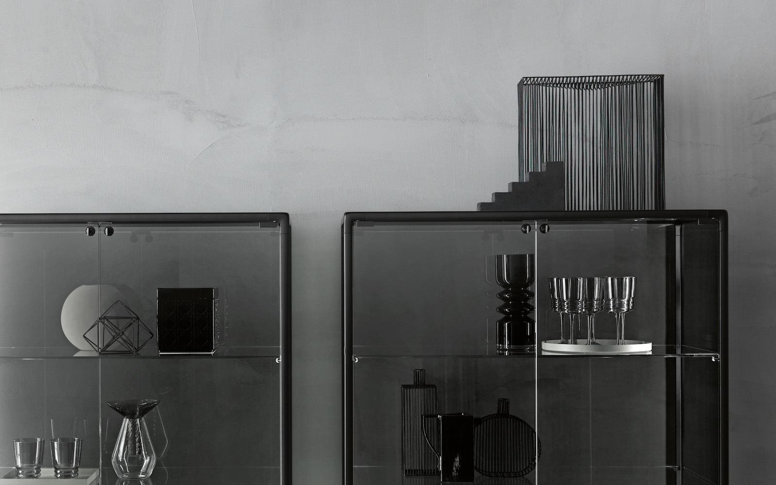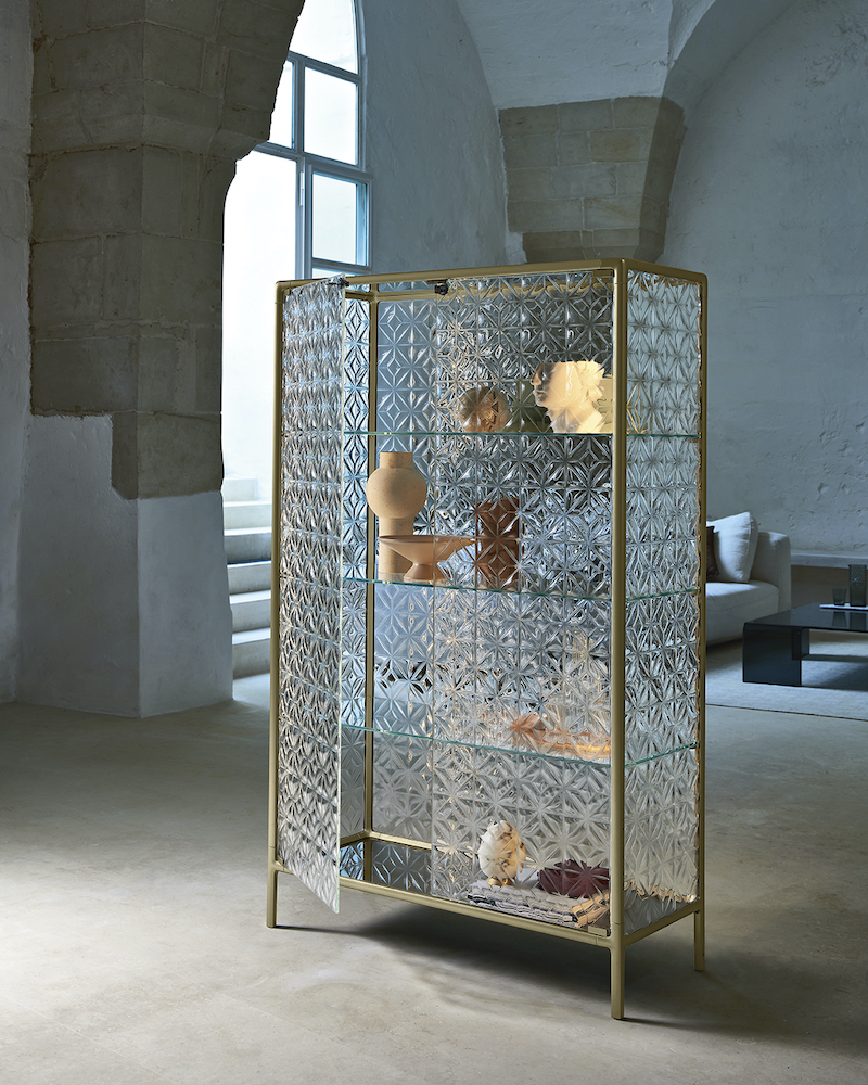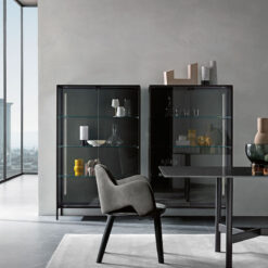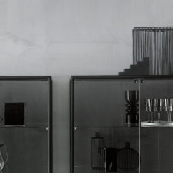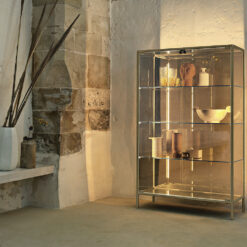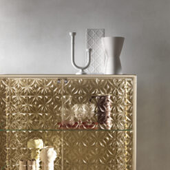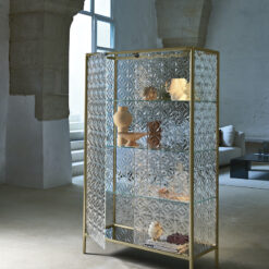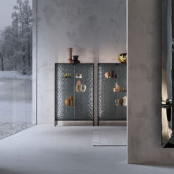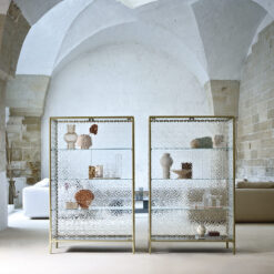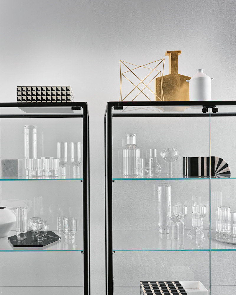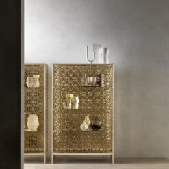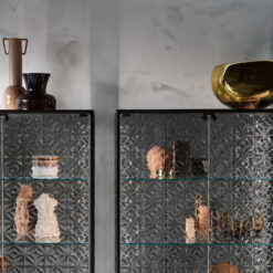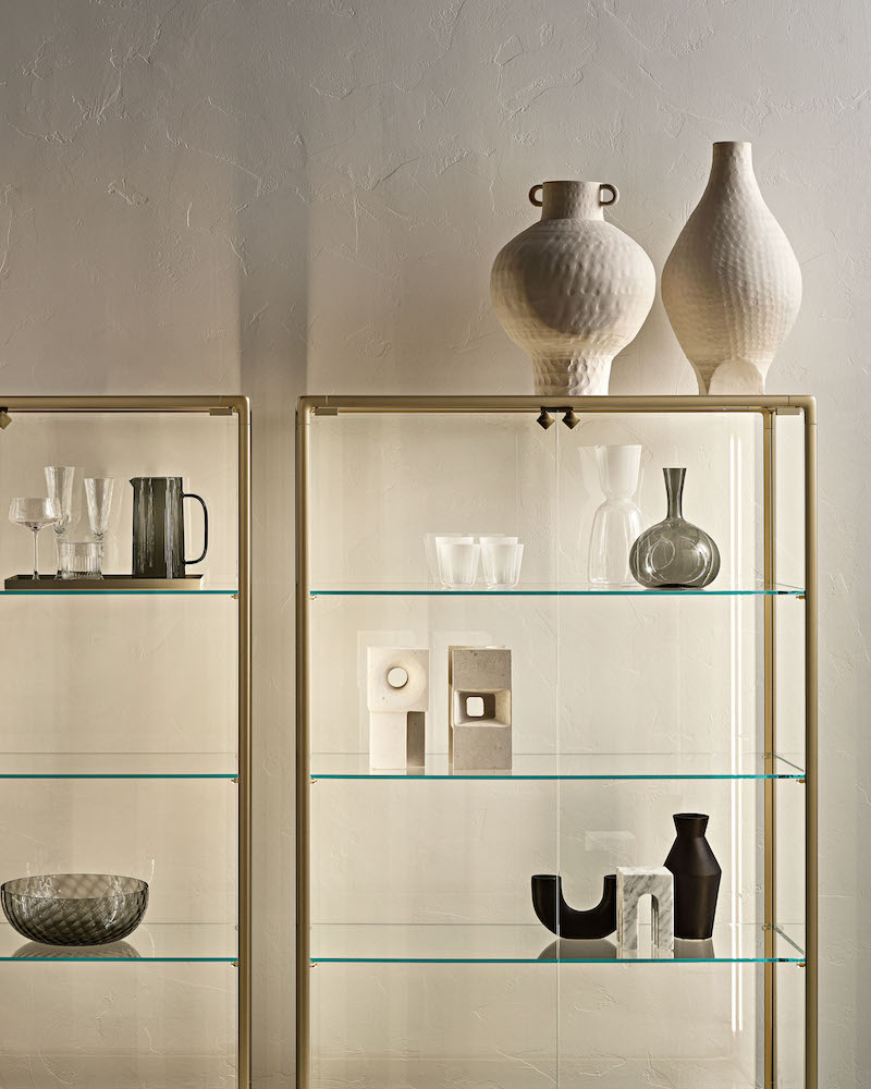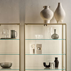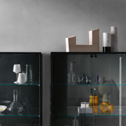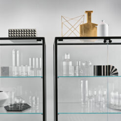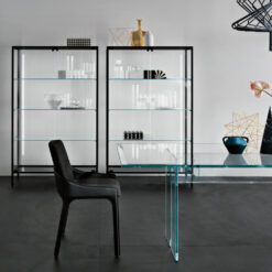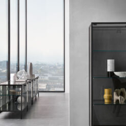 Base in 6 mm thick tempered and back lacquered extralight glass of the same profiles color; relevant glass structure and doors in 6 mm thick extralight, smoke or bronze tempered and fused glass; inner shelves in 8 mm thick extralight tempered glass. The showcase is also available in float (non fused) glass and in semi-reflecting glass. LED lighting system integrated in the structure frontal pillars (optional).
