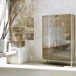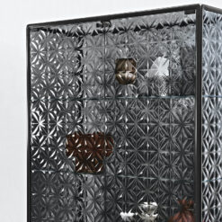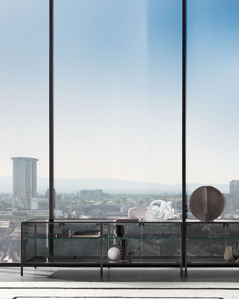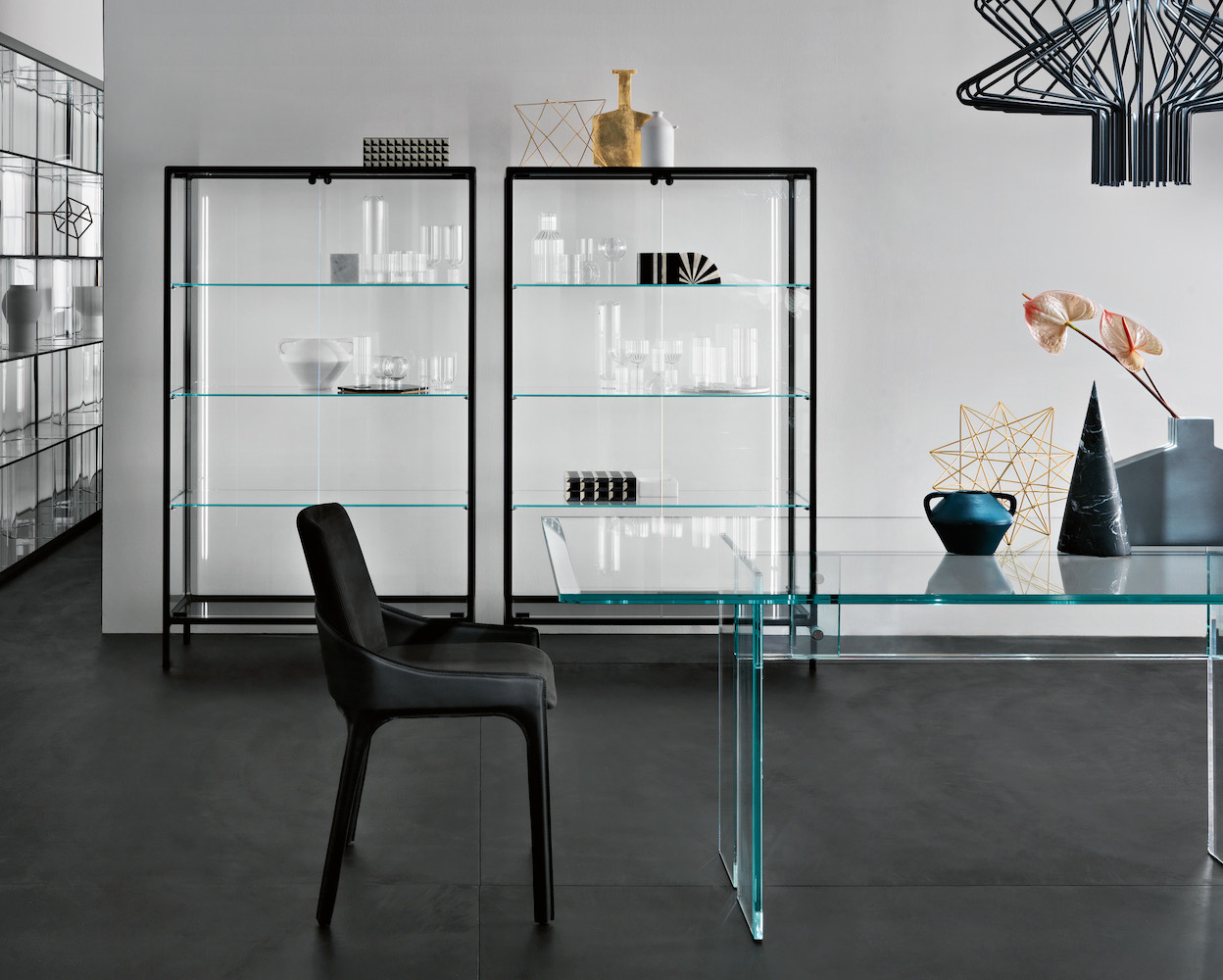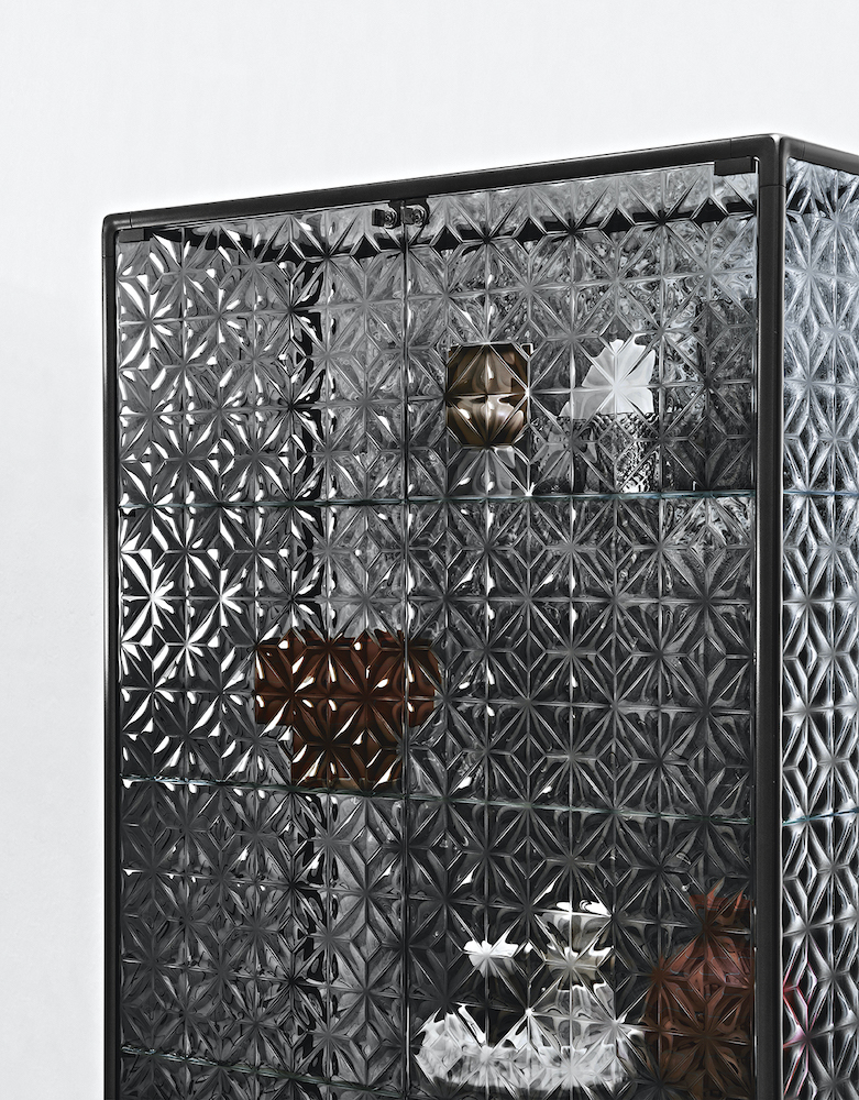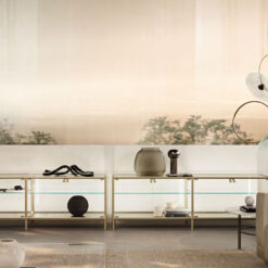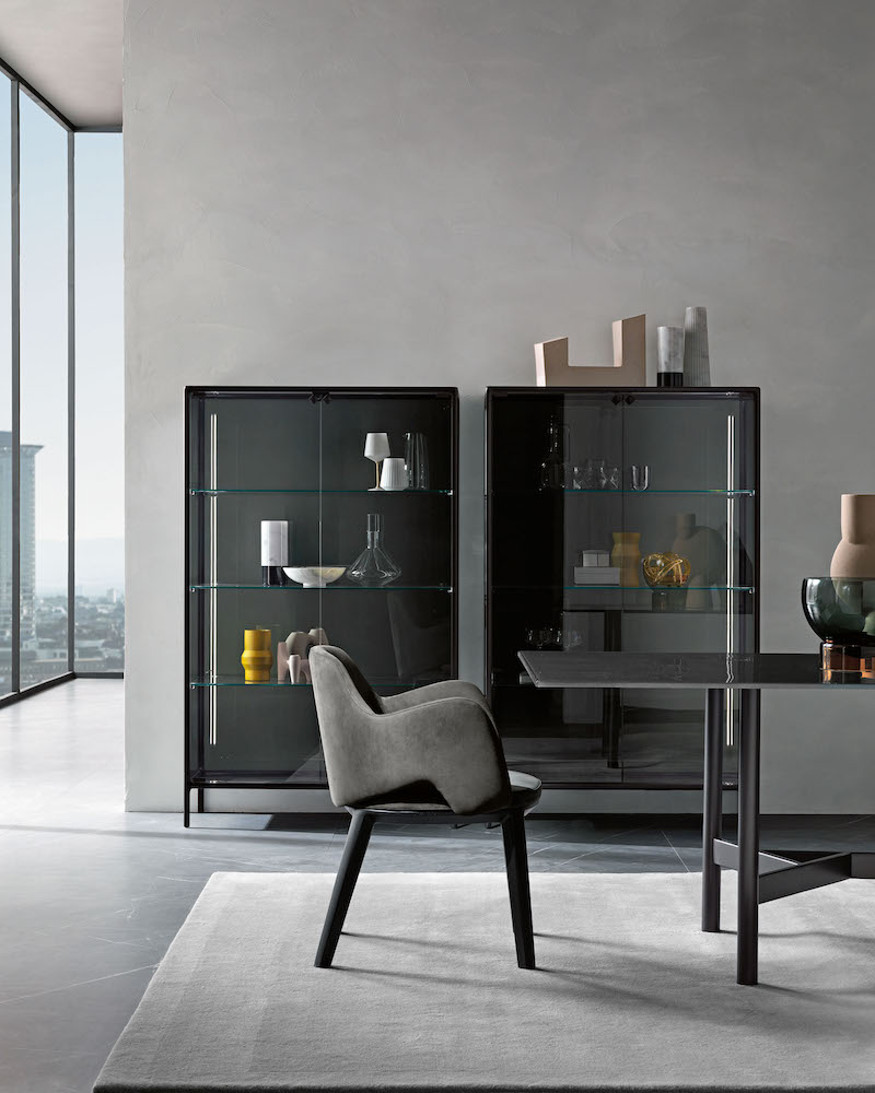 Base in 6 mm thick tempered and back lacquered extralight glass of the same profiles color; relevant glass structure and doors in 6 mm thick extralight, smoke or bronze tempered and fused glass; inner shelves in 8 mm thick extralight tempered glass. The showcase is also available in float (non fused) glass and in semi-reflecting glass. LED lighting system integrated in the structure frontal pillars (optional).