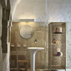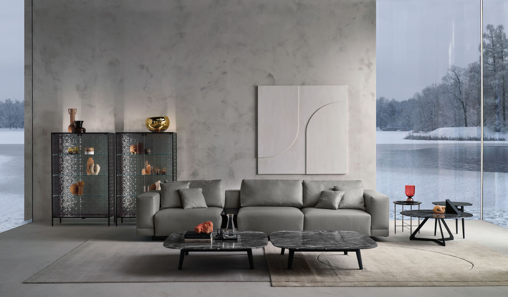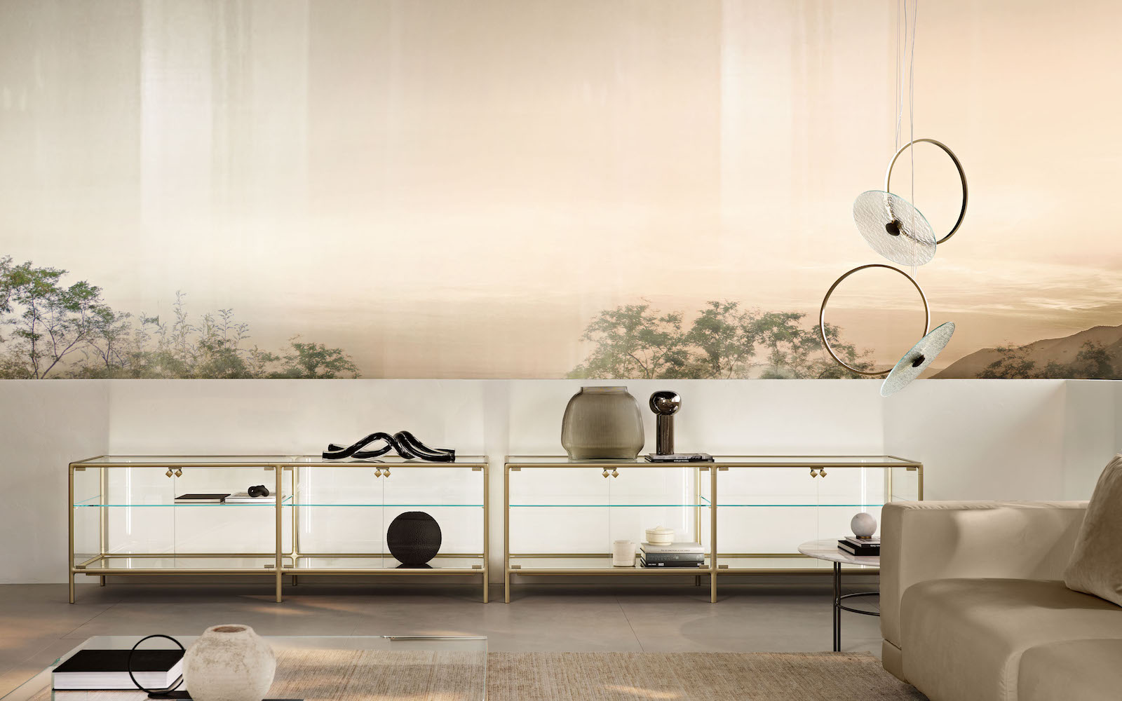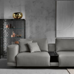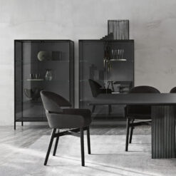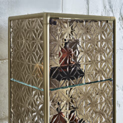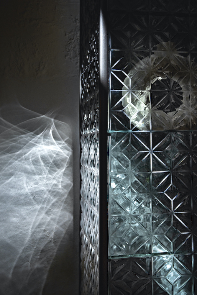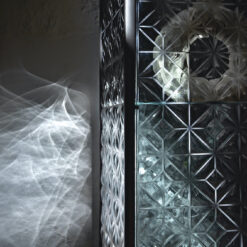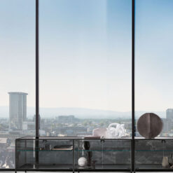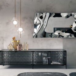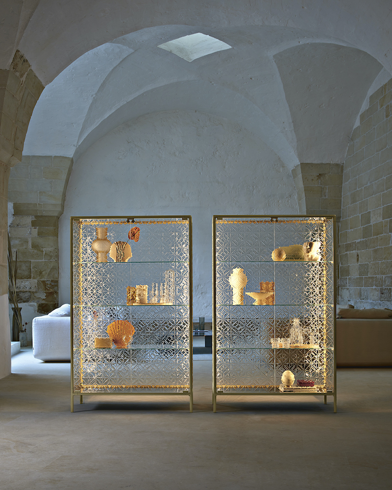 Base in 6 mm thick tempered and back lacquered extralight glass of the same profiles color; relevant glass structure and doors in 6 mm thick extralight, smoke or bronze tempered and fused glass; inner shelves in 8 mm thick extralight tempered glass. The showcase is also available in float (non fused) glass and in semi-reflecting glass. LED lighting system integrated in the structure frontal pillars (optional).