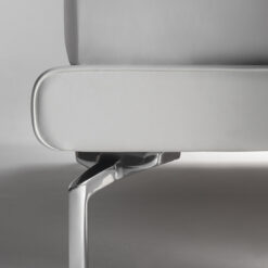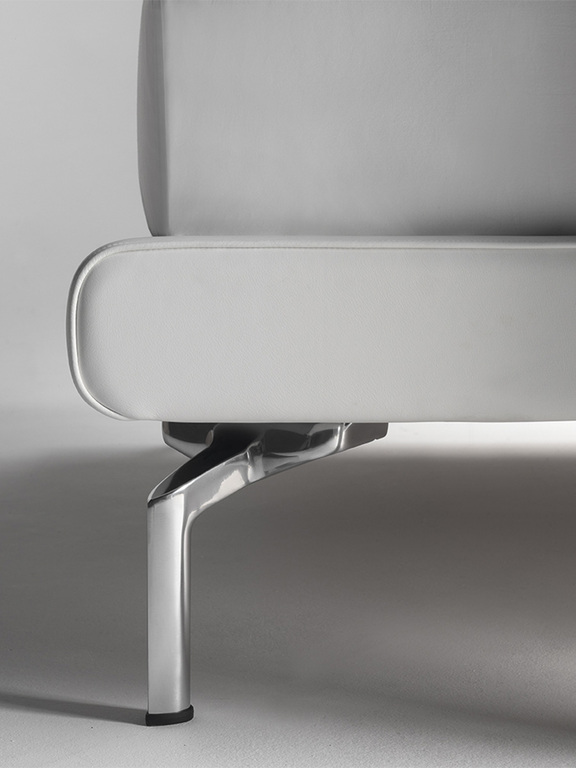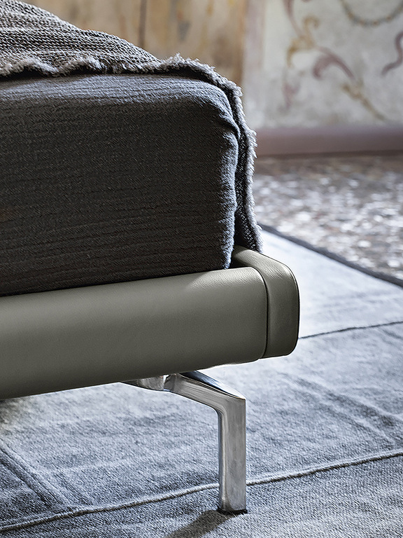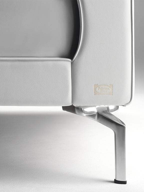 The upholstery is in soft Pelle Frau® leather. The feet are available with polished aluminium or brushed aluminium colour finishes, or covered with 60 mm diameter leather.