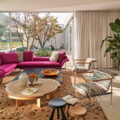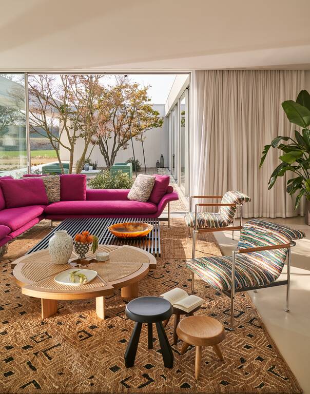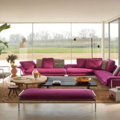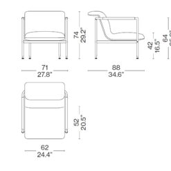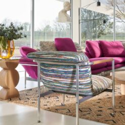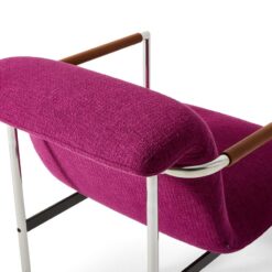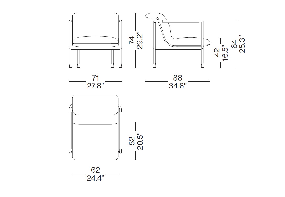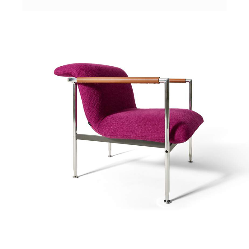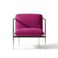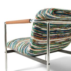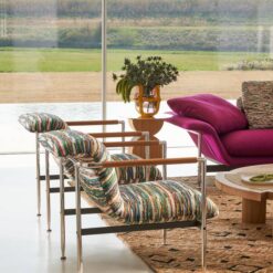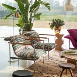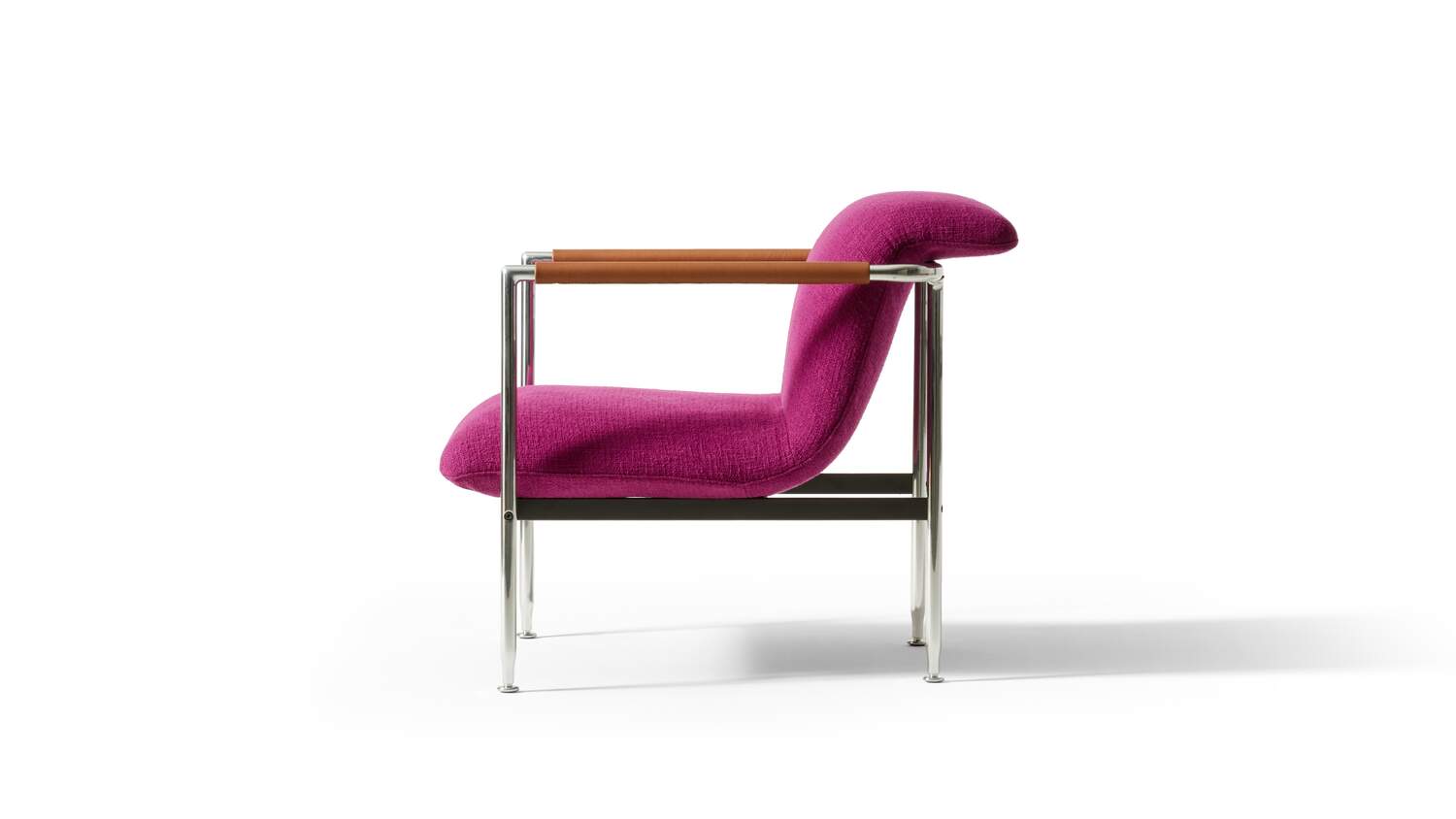 As if floating above the exoskeleton of the structure, a soft padded shell, upholstered in fabric, creates a roomy welcoming seat with a uniquely sinuous design. The Esosoft armchair is informed by the timeless creativity of architect and designer Antonio Citterio and enters into dialogue with the other furniture in the collection. The particular curve of the backrest, which embraces the slender structure, lends shape to the back for an additional casual, light-hearted support upon which to perch. The exacting attention to detail that showcases the excellence of Cassina products is highlighted in the leather-clad armrests embellished with hand-stitching that makes the armchair even more elegant and inviting. The Esosoft Armchair was designed with a focus on sustainability, utilising circular materials like polyurethane with a percentage of polyols derived from biological sources and recycled PET wadding in the padding. The base can be completely disassembled to facilitate recovery of the materials at the end of its life-cycle.
