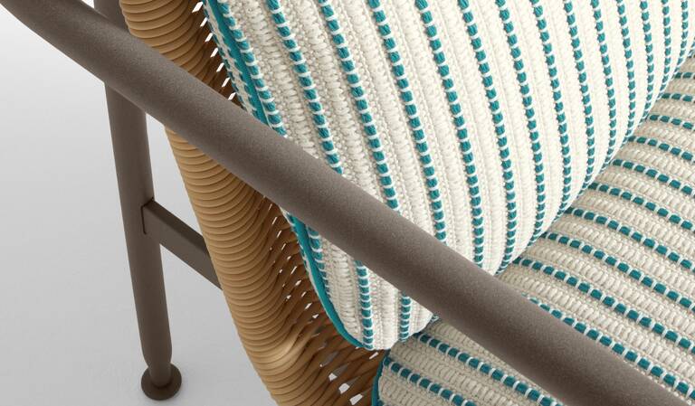 Based on an exoskeleton that supports a shell in hand-woven fibre, the armchair mingles the industrial dimension with the artisanal: the basket, made with an elaborate weave reminiscent of woven wicker, is envisioned as a container for the cushions that can be freely positioned against the backrest.