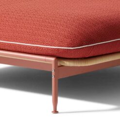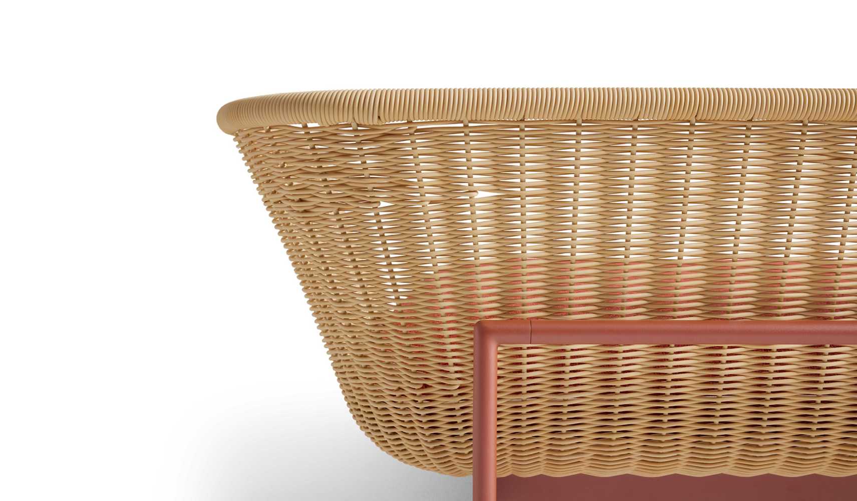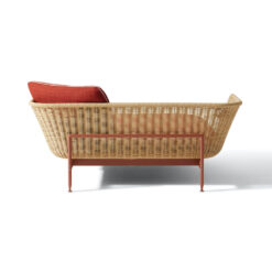 As with the other pieces in the family, an exoskeleton supports a shell in hand-woven fibre, similar to natural fibre. The basket, made with an elaborate weave reminiscent of ancient handiwork, is a container for the cushions that can be configured in different arrangements against the backrest as needed.