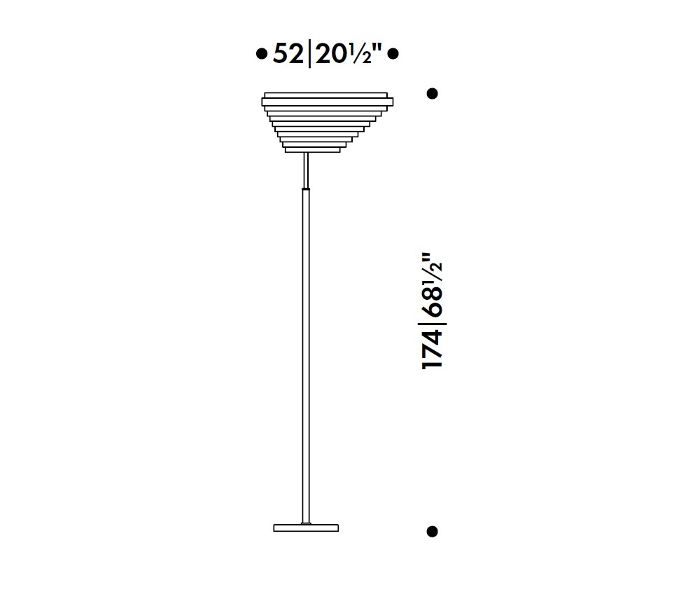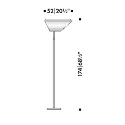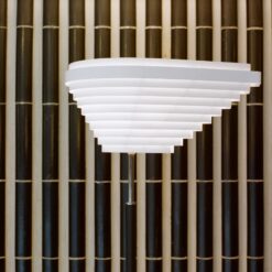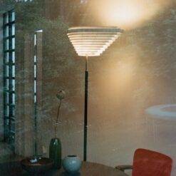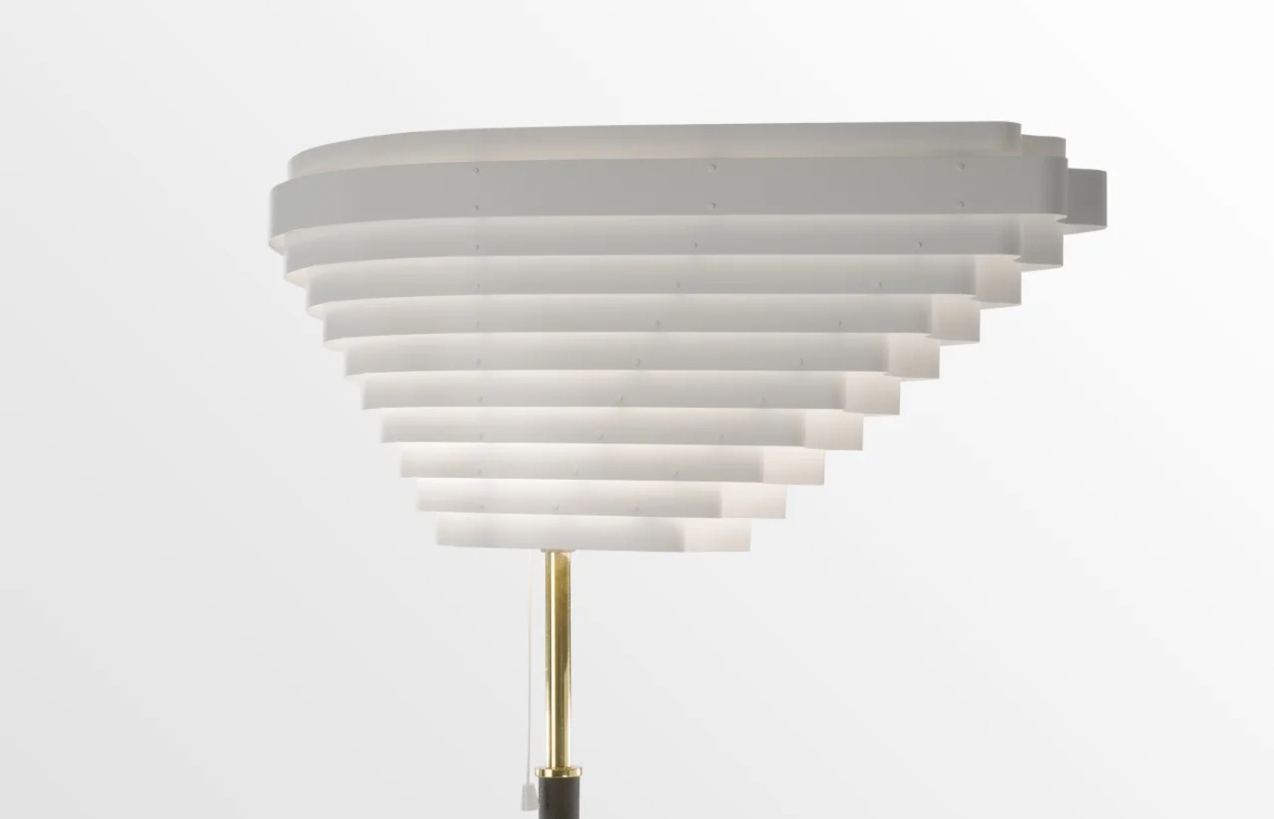 Floor Light A805 features a hand-riveted shade formed from delicate, lacquered metal strips. It presents a striking combination of lines and curves while allowing for an interesting interplay of direct and indirect light. A polished brass collar provides appealing contrast with the white shade, and the black leather finish of the stand is hand sewn in Finland. The asymmetrical shape is reminiscent of an angel’s wing – hence the nickname. “Angel Wing” was designed by Alvar Aalto in 1954 for the National Pensions Institute in Helsinki.