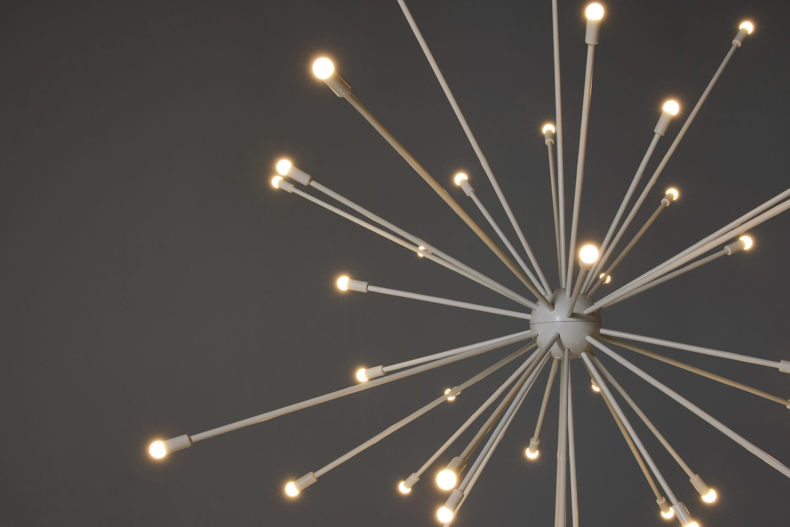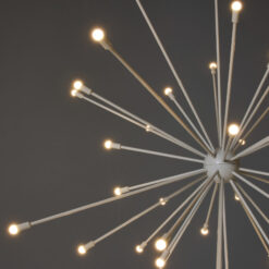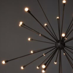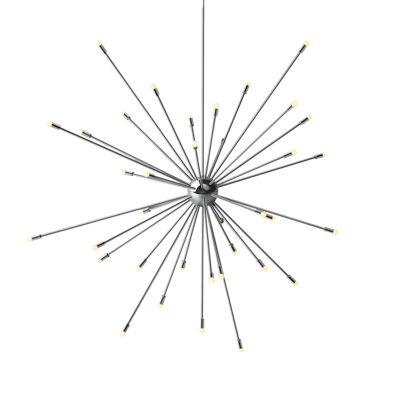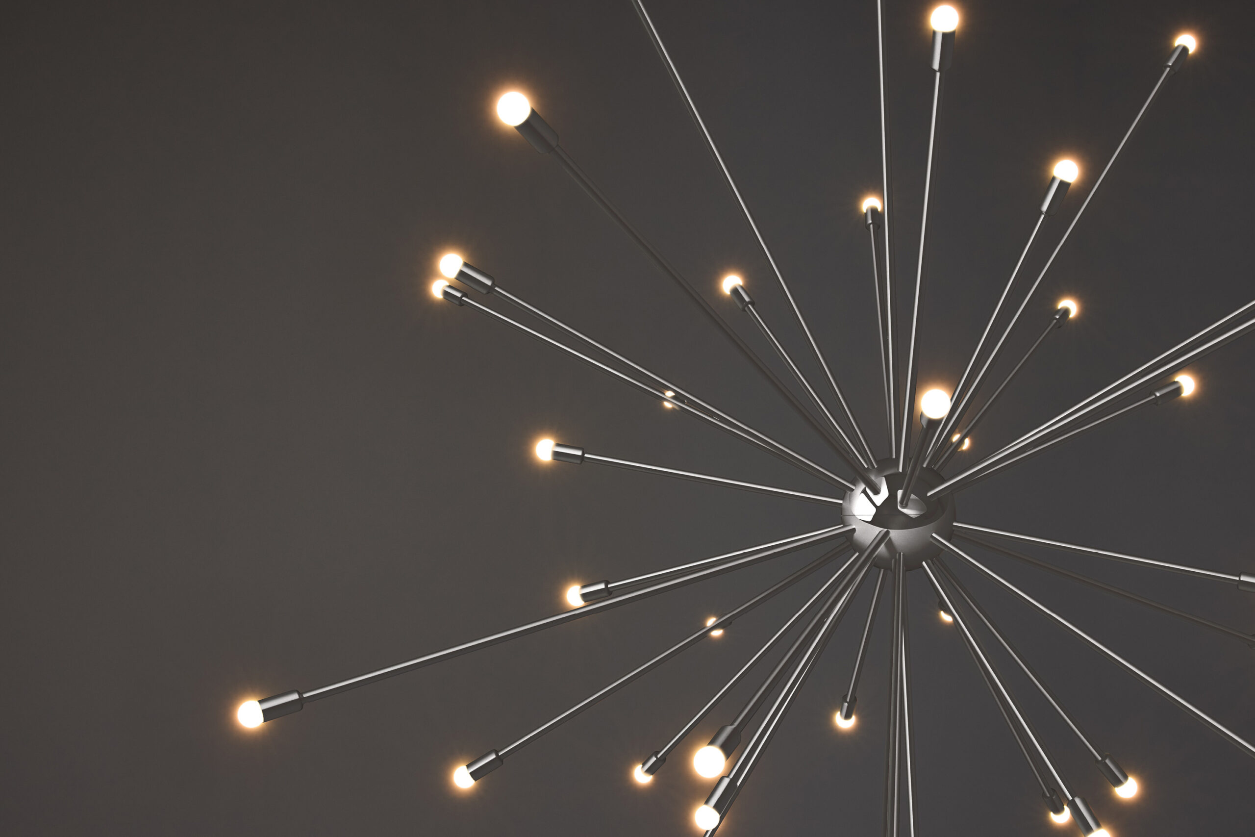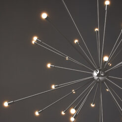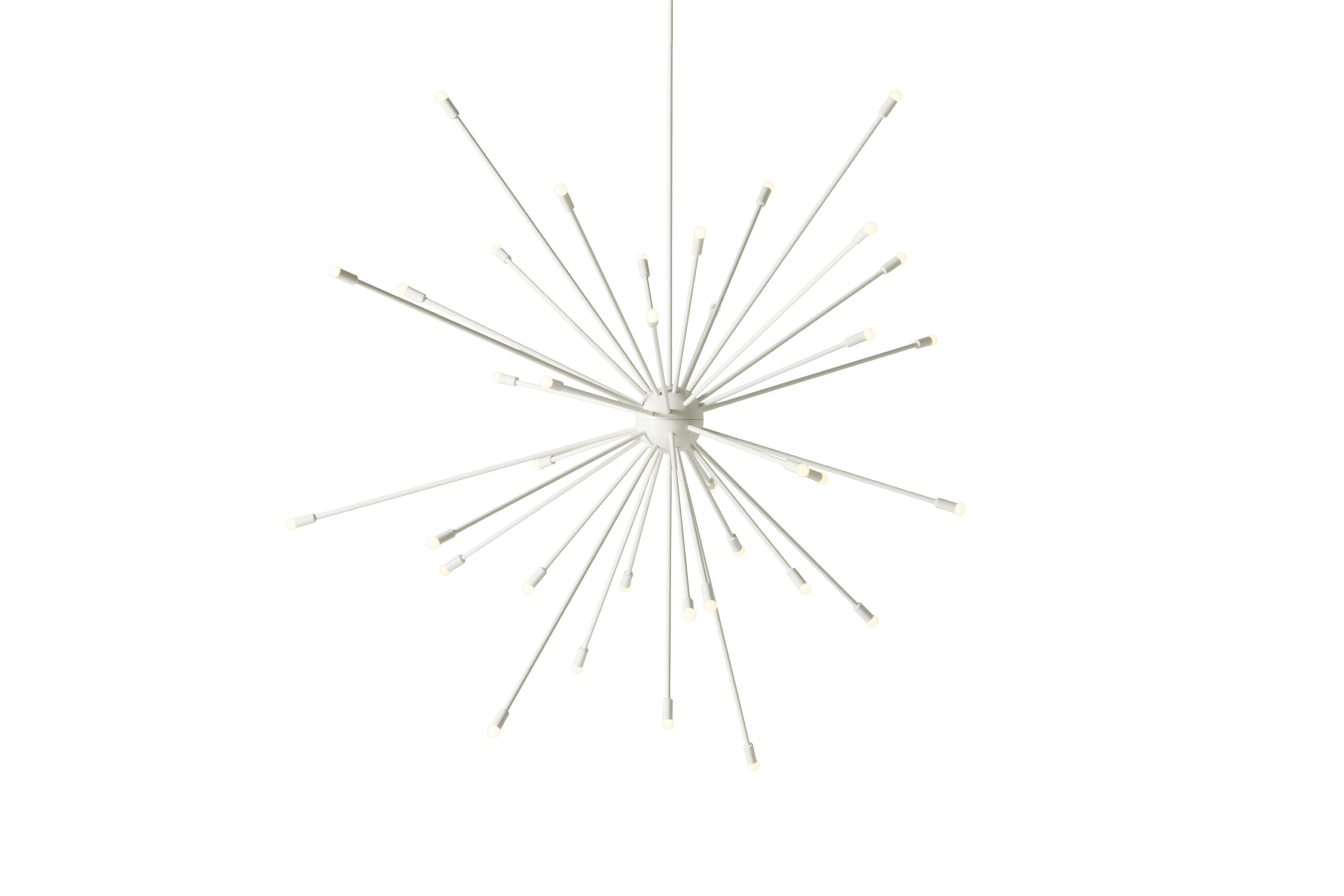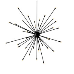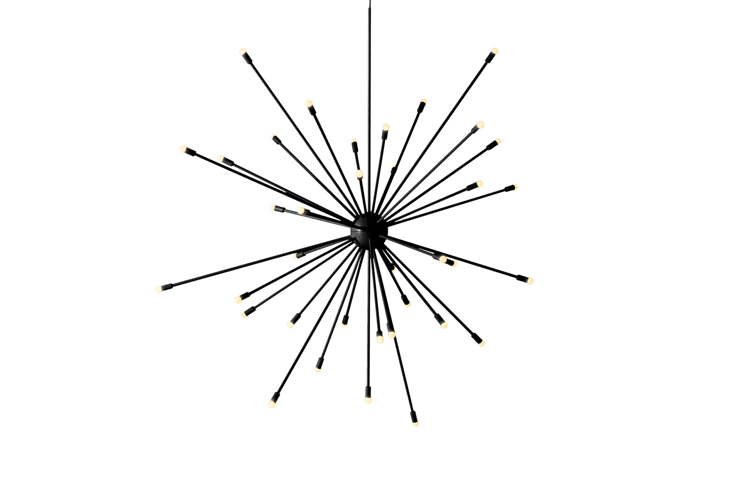 The pendant light is composed of a centre sphere that holds 36 rods of different lengths, each with its own LED light source, as if to evoke a star-studded sky. Cassina has innovated the original design with the addition of a ‘plug & play’ system that allows the rods to be inserted into the sphere to illuminate the space, while at the same time allowing the size of the packaging to be extremely small, compared to the dimensions of the final product.