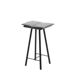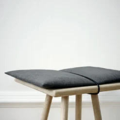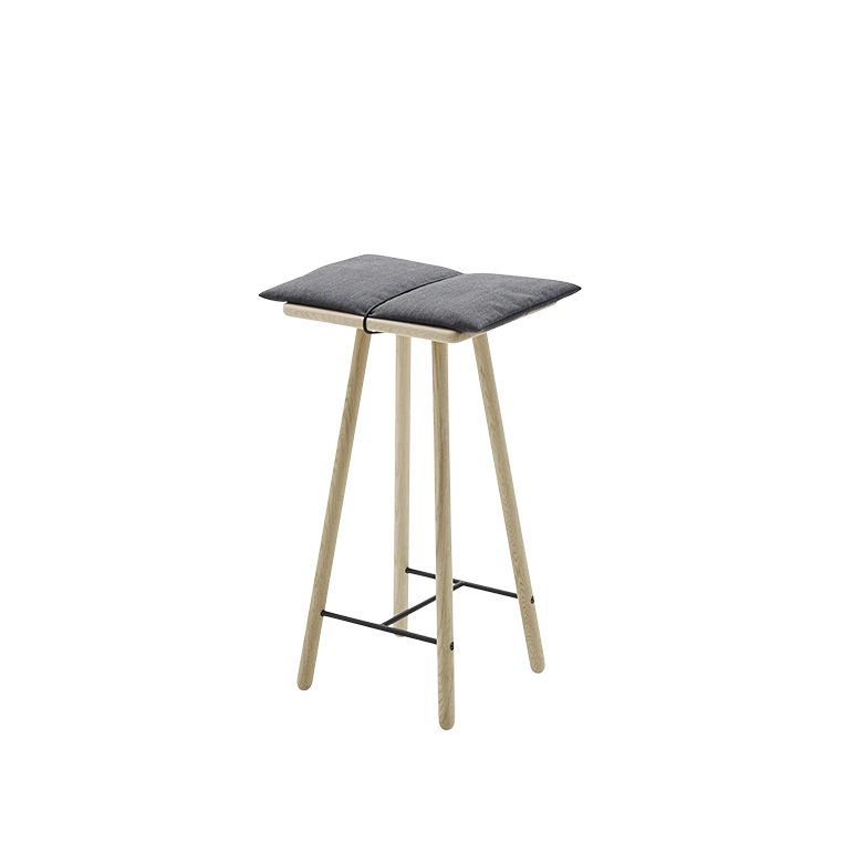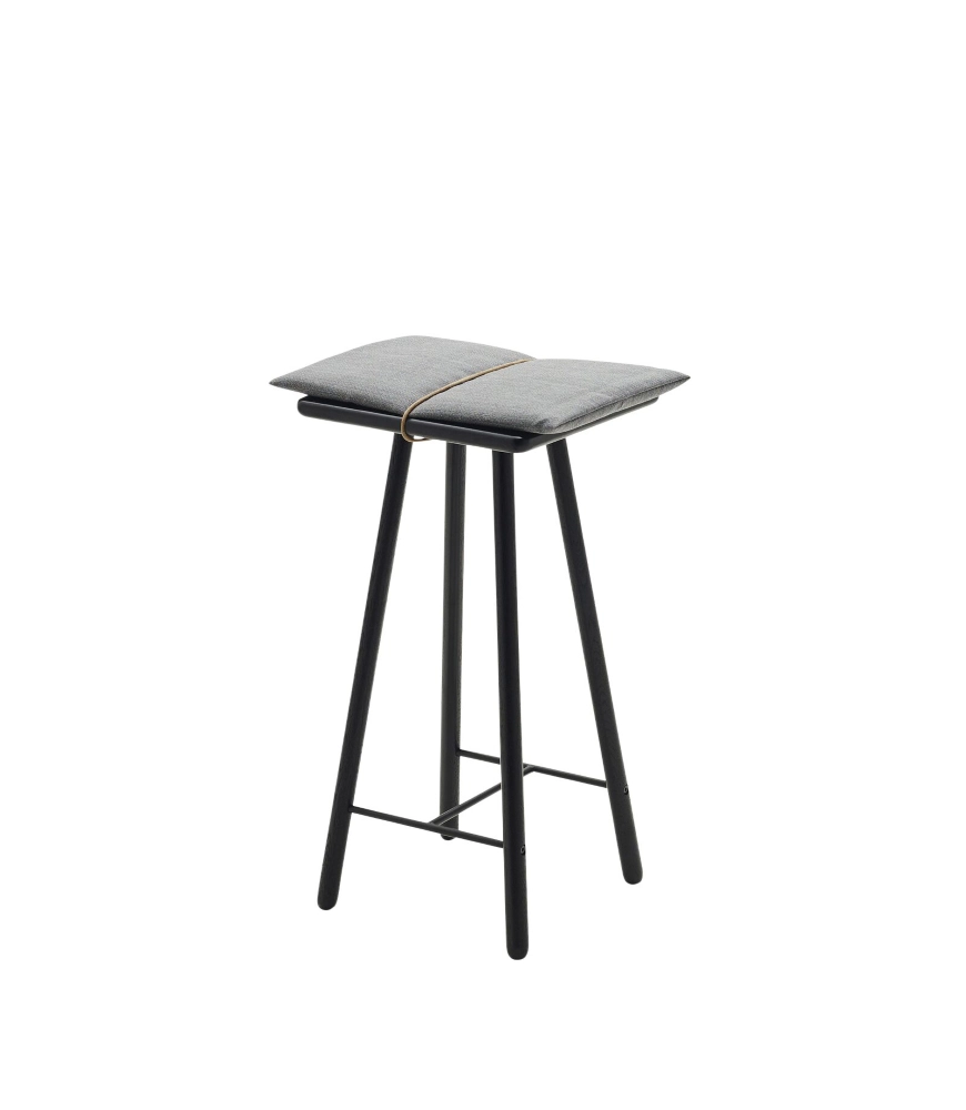 The Georg Bar Stool design is characterised by the slender wooden poles and soft surface, where a woollen cushion is kept in place by a leather strap. Made of FSC-certified oak, the legs are stabilised by a metal H-frame that also serves as a comfortable footrest.