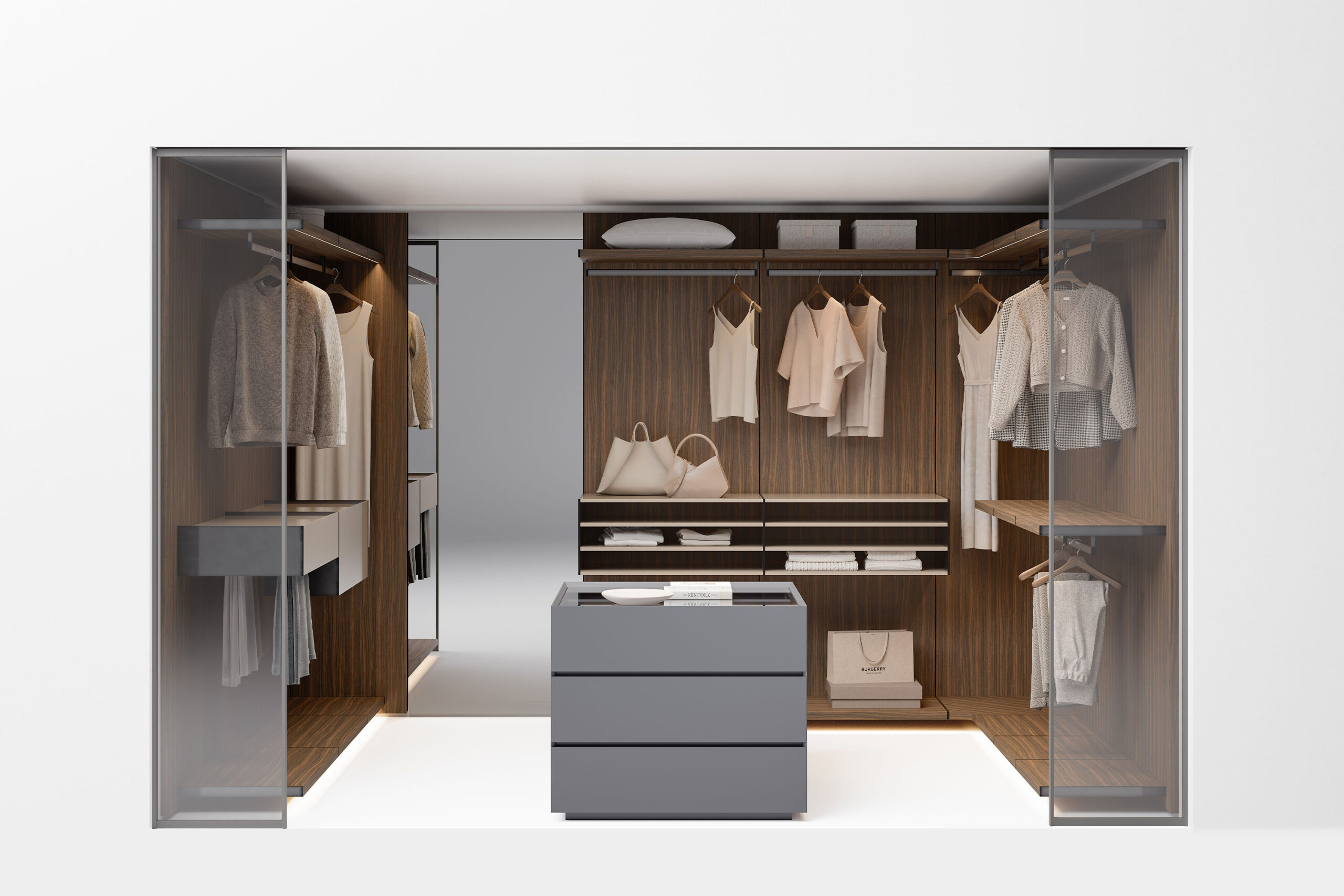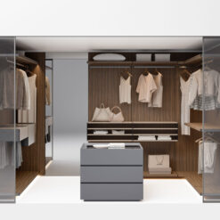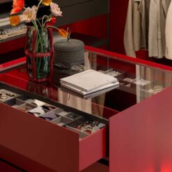 The Ghost Wall – WW allows customisation of the walk-in wardrobe with any of the accessories already available in the Ghost Wall catalogue, and can be completed with Ghost Wall – Doors sliding panels. The collection also includes a central island designed to maximize space and optimize organization of the walk-in wardrobe. They can be used as an individual unit or in pairs and are available with a lacquered top or in a version with glass top, which allows the upper drawer to become a display case with the bottom of the drawer lined or lacquered.
