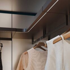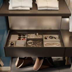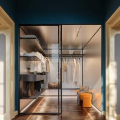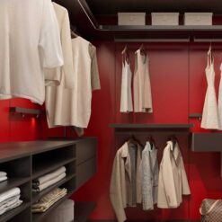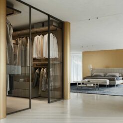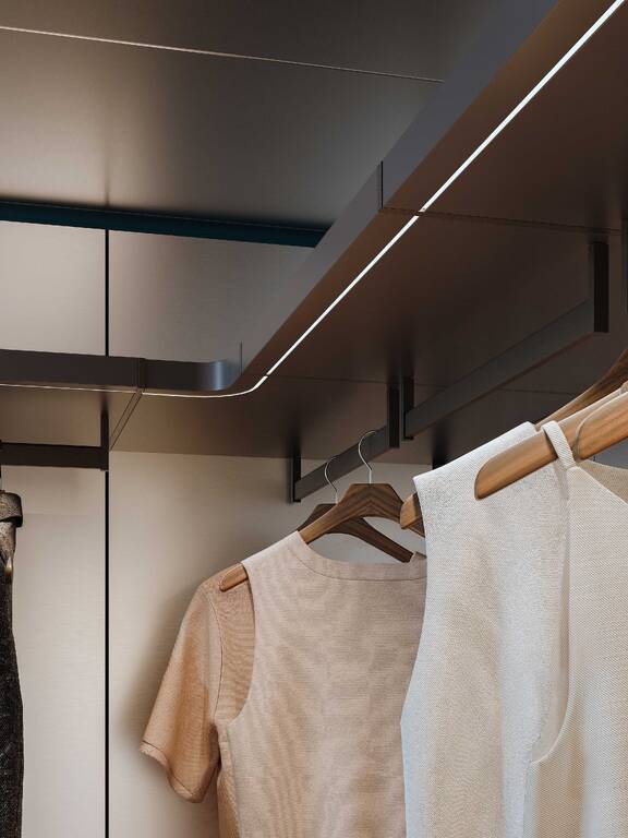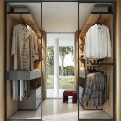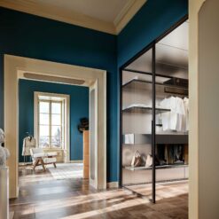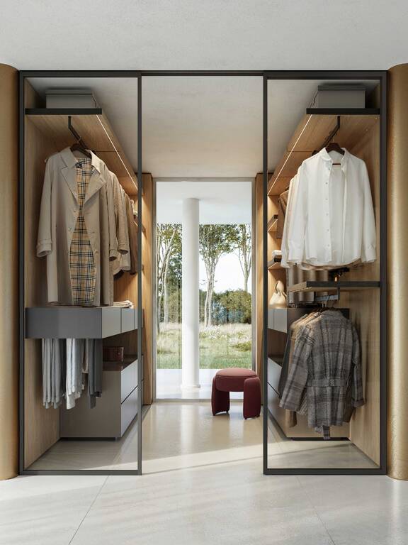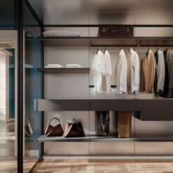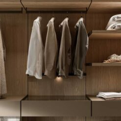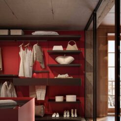 In the bedroom, in keeping with the Walk-in Wardrobe concept, the system becomes Ghost Wall – WW, a useful tool for organising and customising the wardrobe with a series of specific accessories, including trouser hangers, drawers with display cases, shelves with clothes hangers and shoe racks, and multiple modules for shirts or jumpers.