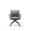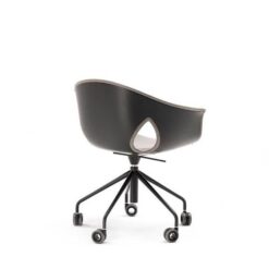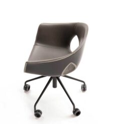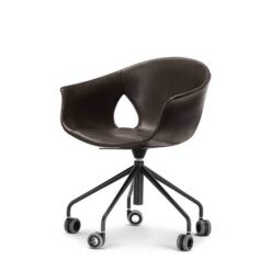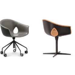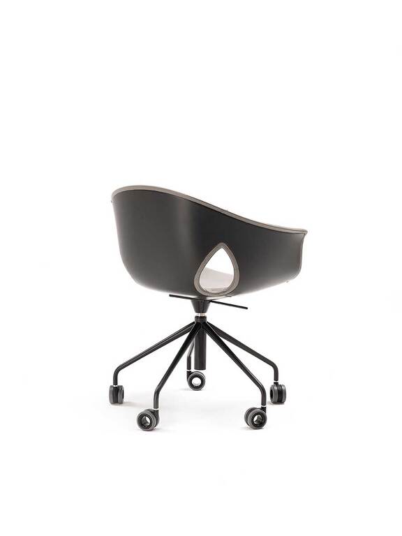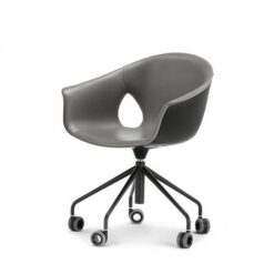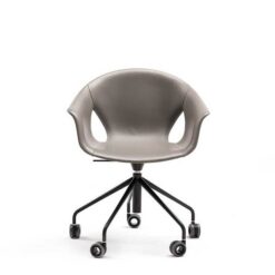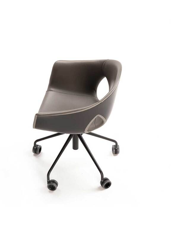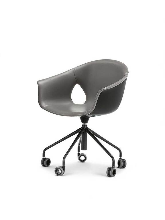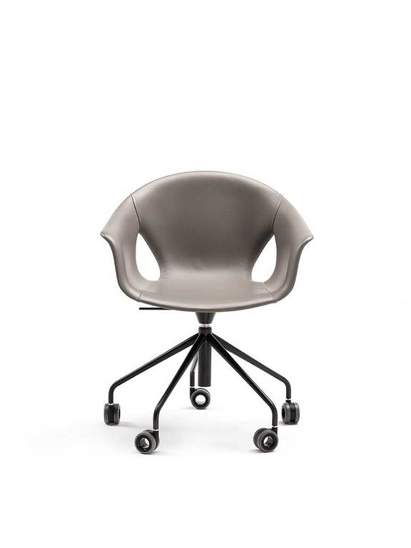 The Ginger Ale armchair features a five-spoke base in painted steel with wheels, available in both a 360° swivel version with fixed height and a version with a gas spring for seat height adjustment. The upholstery can be entirely made of Pelle Frau®, with a matching upholstered shell, or in a combination that uses Pelle Frau® for the inner upholstery and a painted shell for the exterior.