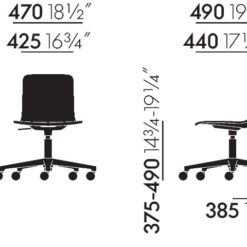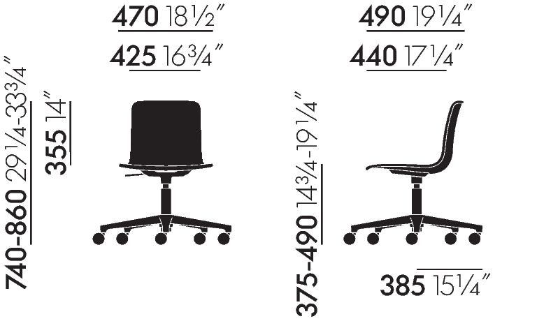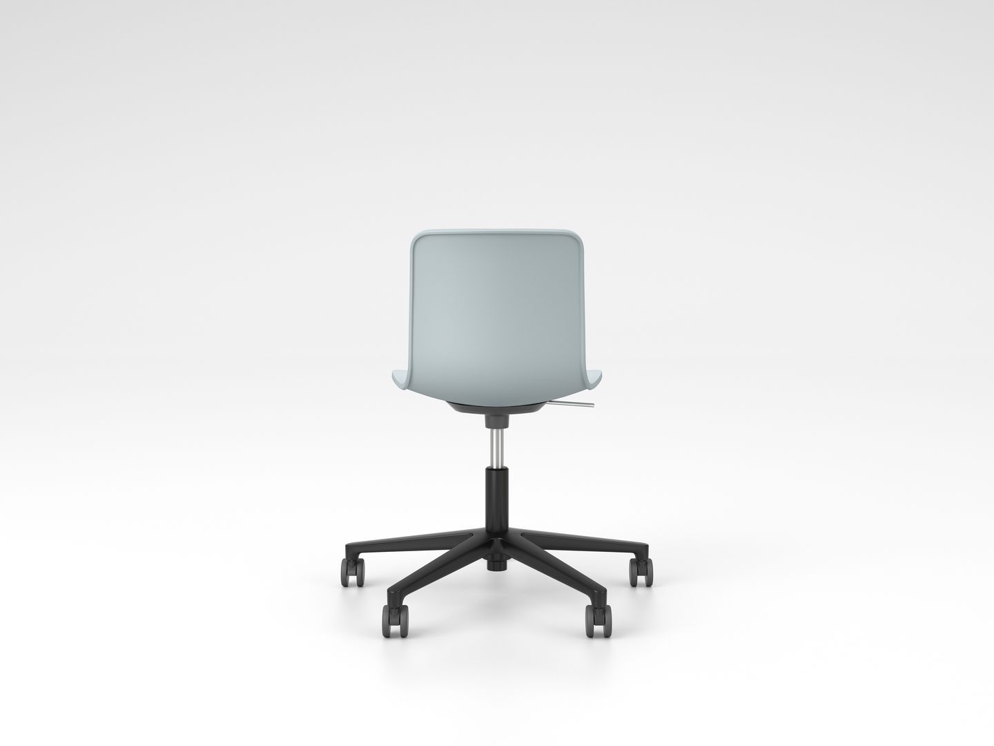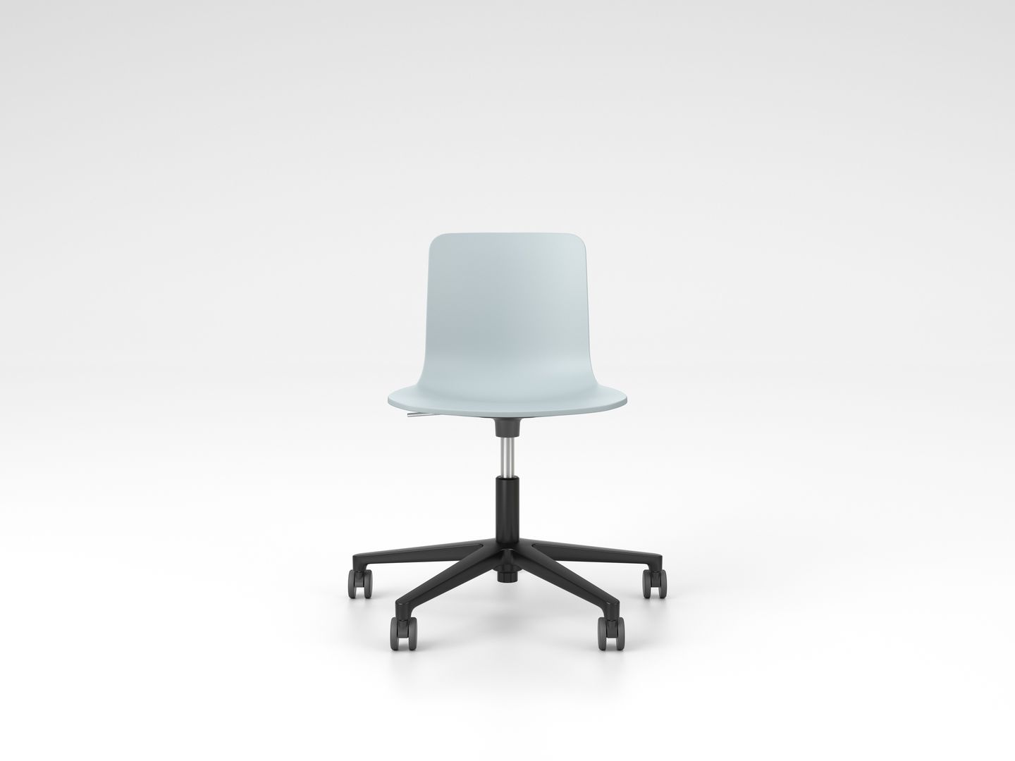 five-star base in die-cast aluminium powder-coated in basic dark. Swivel mechanism with shock-absorbing seat suspension, height-adjustable.