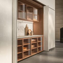 The opening mechanism of Hide Pro differs from the previous model as there is no track on the floor, which permits a seamless design and easy access to the cabinet. In addition, the push opening mechanism permits a handle-free solution as the door opens and closes by applying minimal pressure. The internal layout of Hide Pro differs from Hide in that it allows the possibility to insert base and wall units from the Boffi kitchen systems price list, thus offering greater design flexibility.
