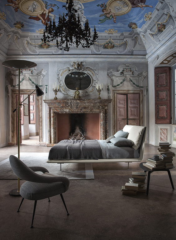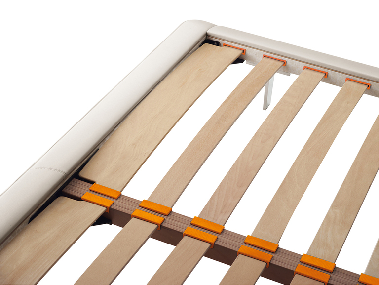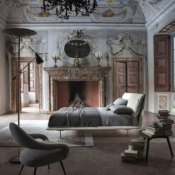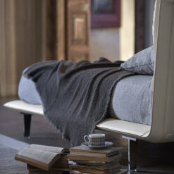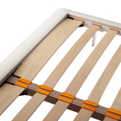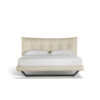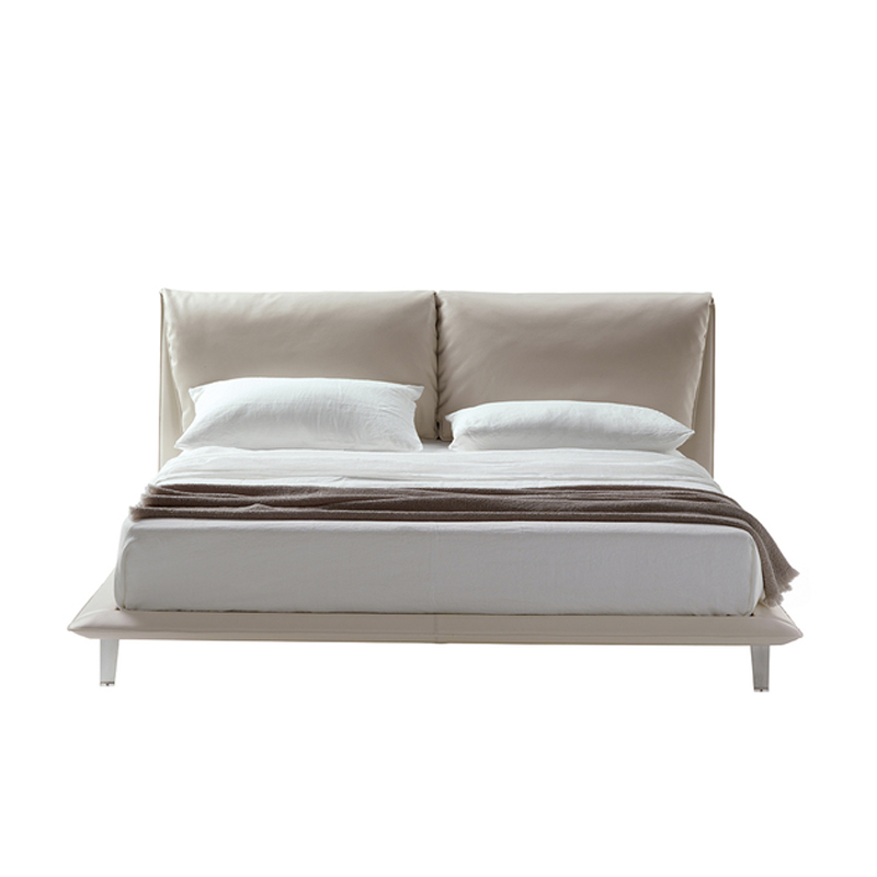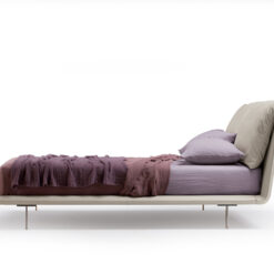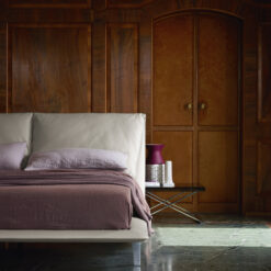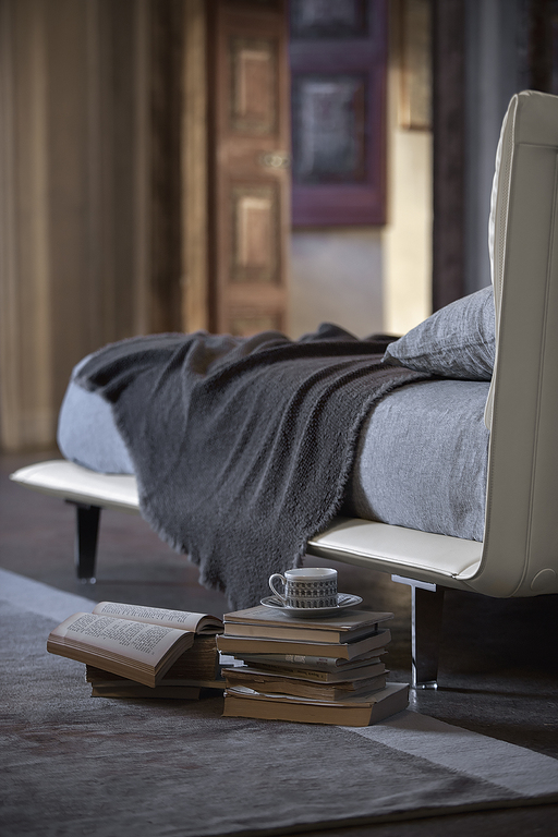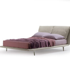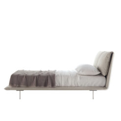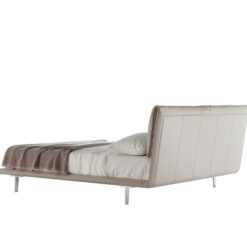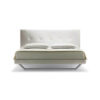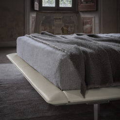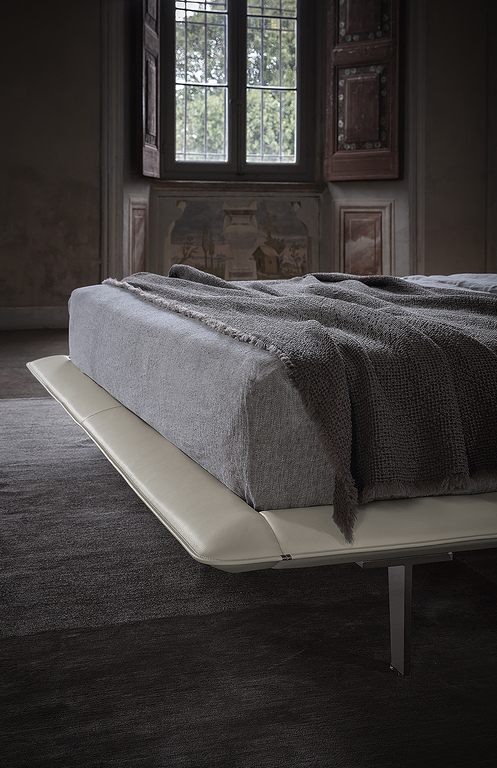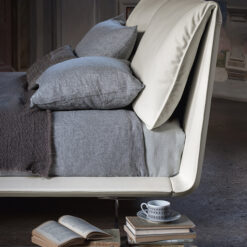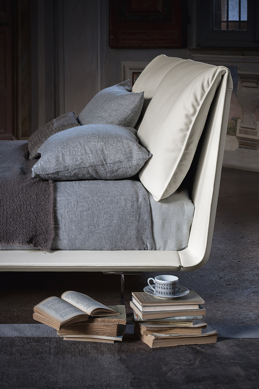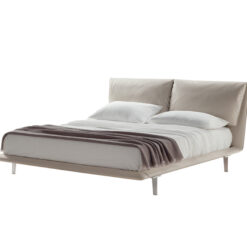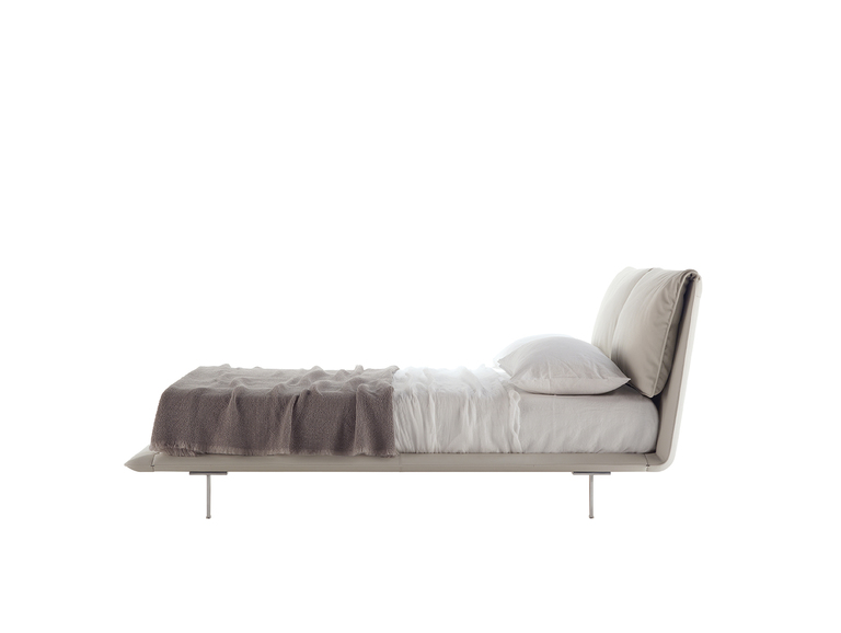 The structure of the John-John Bed headboard is made from solid beech and poplar with MDF infill and padding in polyurethane foam. The cushions are padded in goose down and polyester wadding and attached to the structure by the Pelle Frau® leather upholstery. The bed frame is made from solid beech and poplar with padding in polyurethane foam and is designed to accommodate an ad hoc bed surface consisting of a series of beechwood slats that are fixed to the central crossbar. The Poltrona Frau® slat kit is available in two versions, rigid or with adjustable lower back support. Feet in aluminium with Ruthenium finish. John-John Bed is upholstered in Pelle Frau® leather.