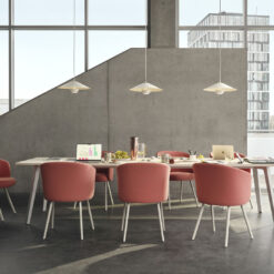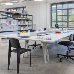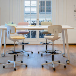 The base can be configured in diverse shapes and sizes for sitting or standing-height tables – on either glides or castors. Furniture on castors promotes dynamic work methods in the office, while variants with glides enable electrification cables to be concealed in the table legs.