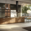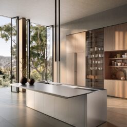 The cooking block is equipped with a completely disappearing stainless steel retro-cooking hood, confirming Boffi’s attention to detail and the quality of the materials. The opening of the fronts occurs through an upper chamfer, a detail that makes the use of the kitchen intuitive and at the same time aesthetically refined.