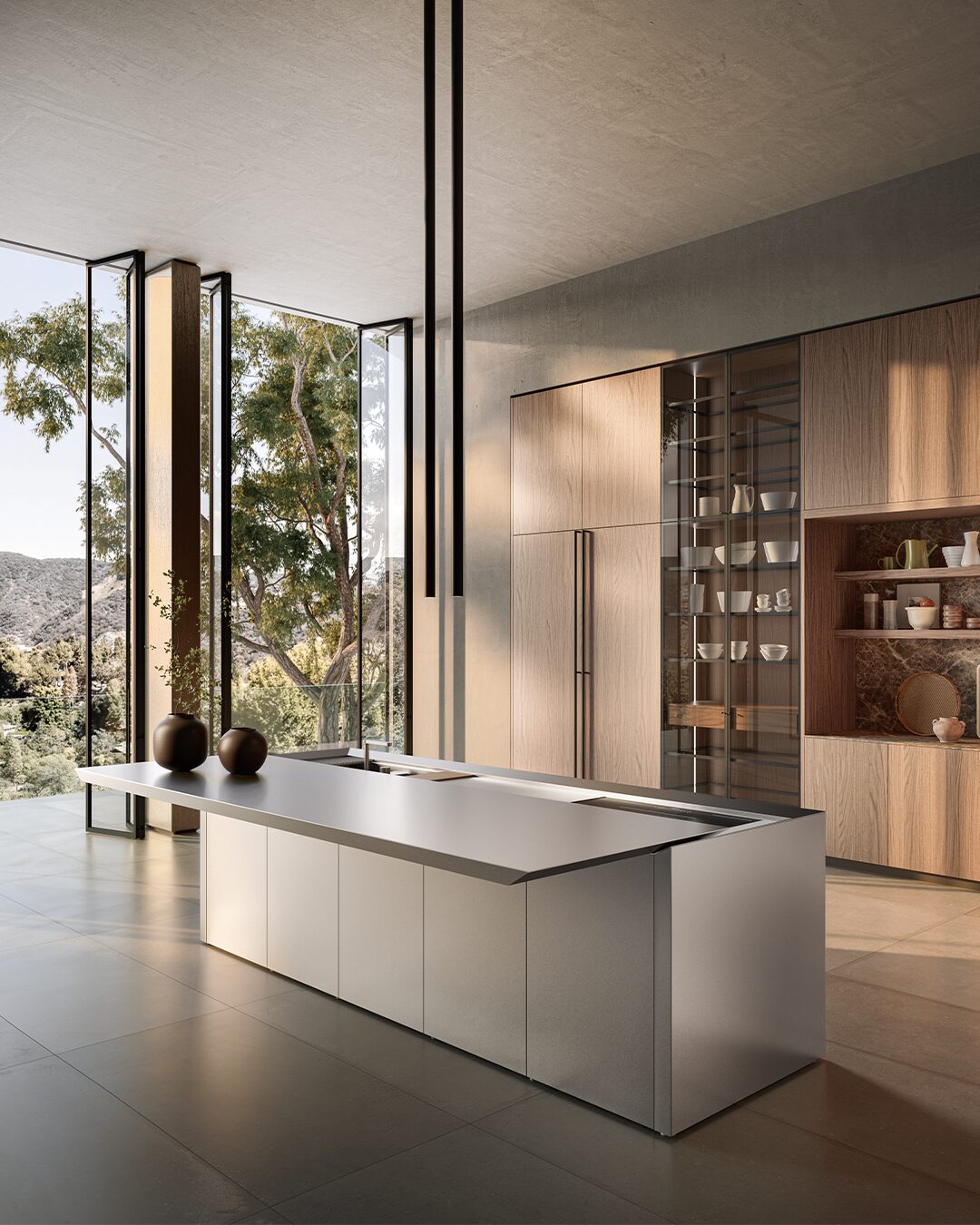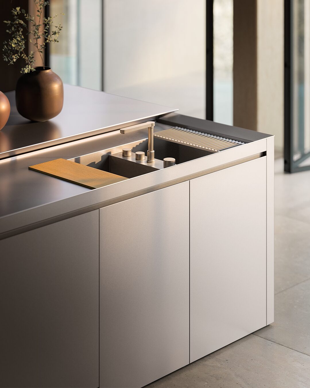 When the sliding top is closed, the K6 kitchen top presents a homogeneous and totally linear appearance, emphasizing a monolithic and defined aesthetic. This feature not only makes the kitchen visually attractive, but also offers a practical solution for maintaining order and cleanliness.