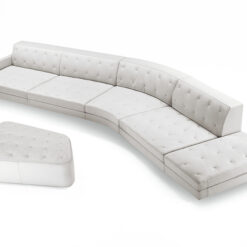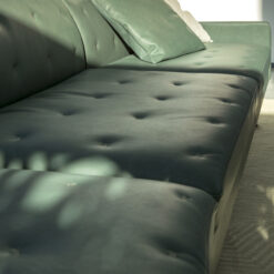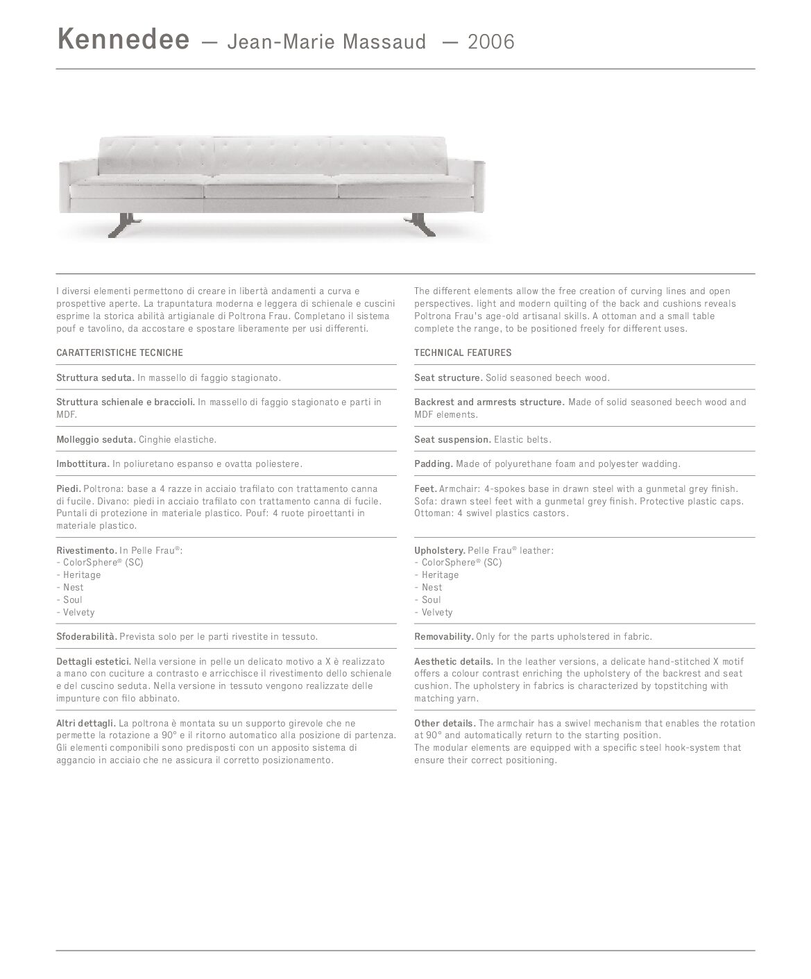 The seat structure is in solid seasoned beechwood while the backrest and armrest structure is in seasoned beechwood and MDF. Polyurethane foam and polyester wadding are used for the padding of the backrest, armrests, cushions and pouf.