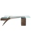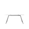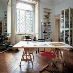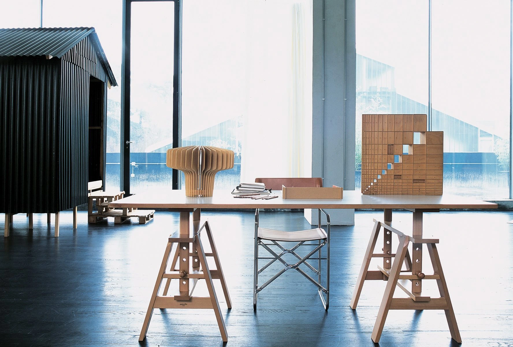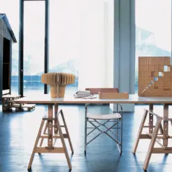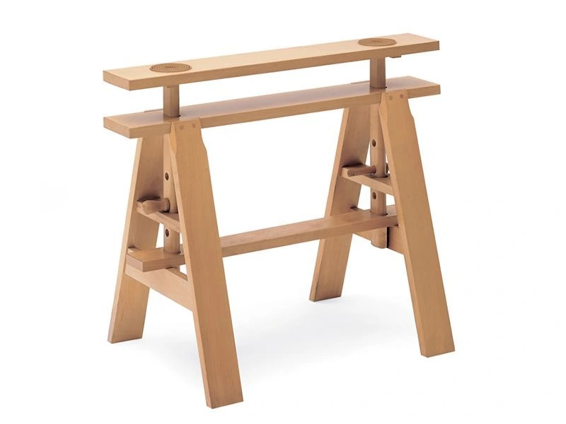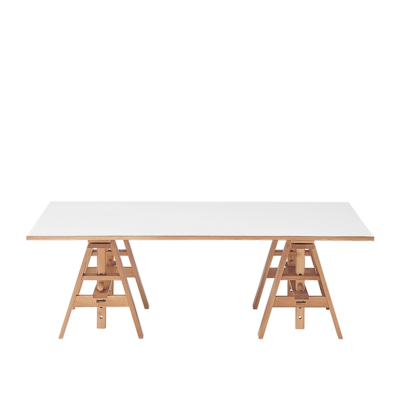 Natural varnished steam- treated beech trestle. Top coated with white plastic laminate, or with tempered plate glass. Adjustable height.