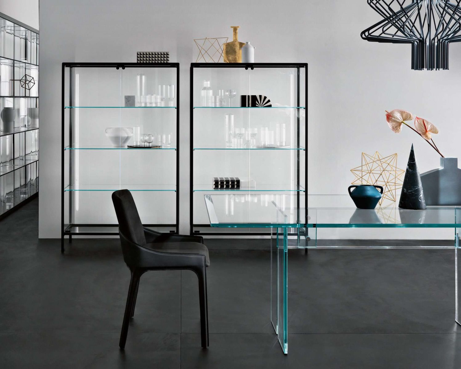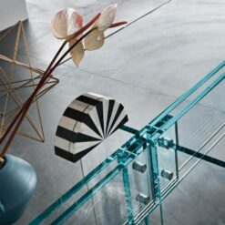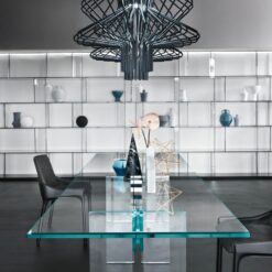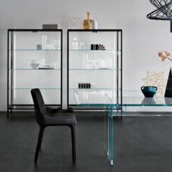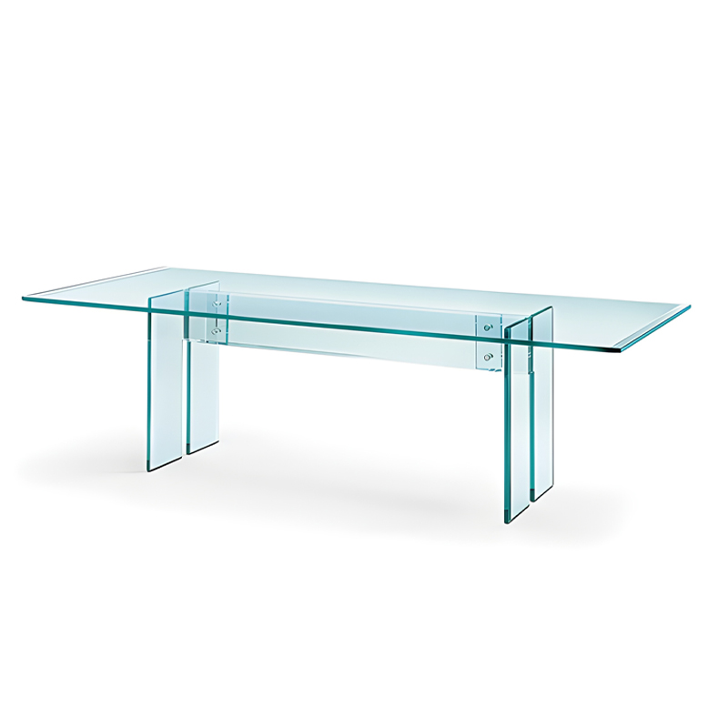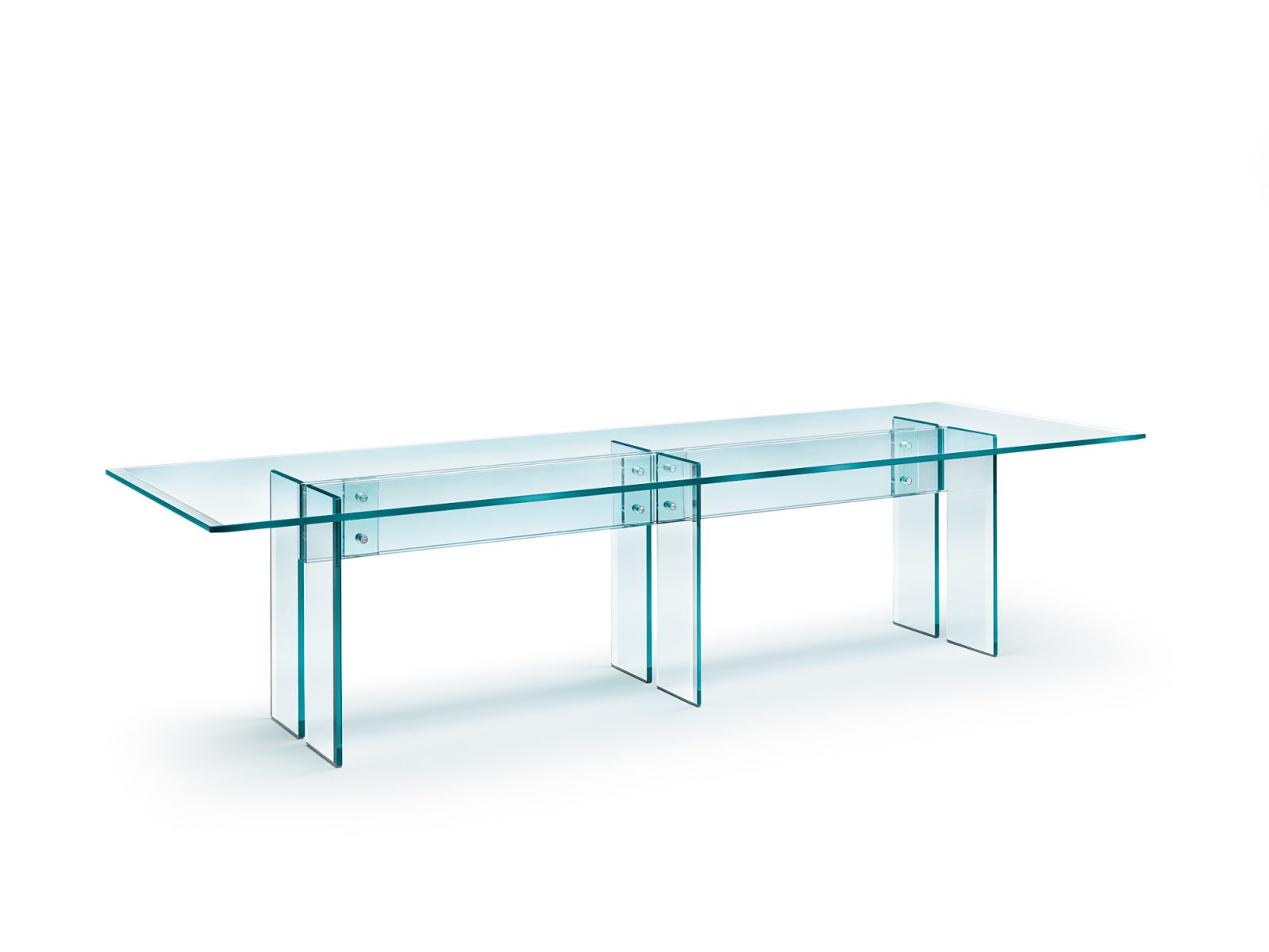 Table composed of a 15 or 19 mm thick transparent glass top with bevelled edges on the two shorter sides and of a base in 15 or 19 mm thick transparent welded glass with bevelled edge.