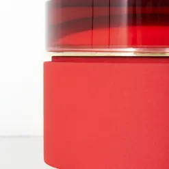The trio of cylindrical coffee tables in different heights and widths feature sleek, see-through cast resin tops in vivid, monochromatic color schemes. Handmade in the Draga & Aurel atelier in Como, the wooden frame of each table is covered by a shiny metal casing composed of brass and aluminum.