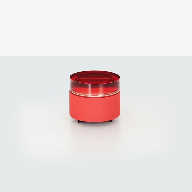 The trio of cylindrical coffee tables in different heights and widths feature sleek, see-through cast resin tops in vivid, monochromatic color schemes. Handmade in the Draga & Aurel atelier in Como, the wooden frame of each table is covered by a shiny metal casing composed of brass and aluminum.