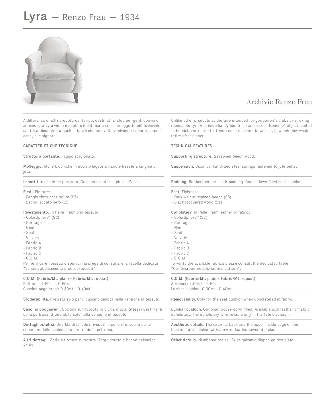 The supporting structure of the Lyra armchair is made from seasoned beechwood. The seat and backrest spring system consists of hand-tied steel biconical springs attached to jute belts. The padding is in rubberised horsehair, and in soft goose down for the seat cushion. The optional lumbar cushion, padded with goose down, provides additional comfort. The Lyra armchair is upholstered in Pelle Frau® leather or fabric and refined with leather-covered pins in the upper part of the backrest and on the back. Lyra is a numbered series with a 24kt gold-plated label.