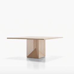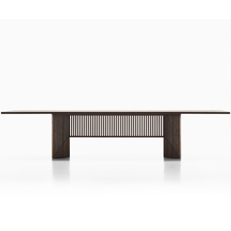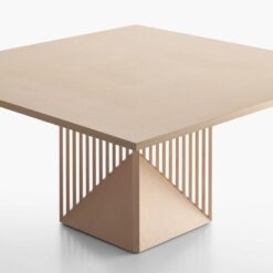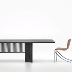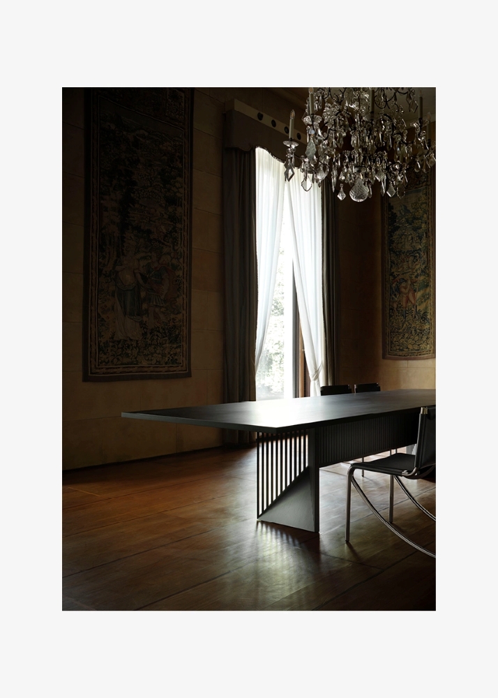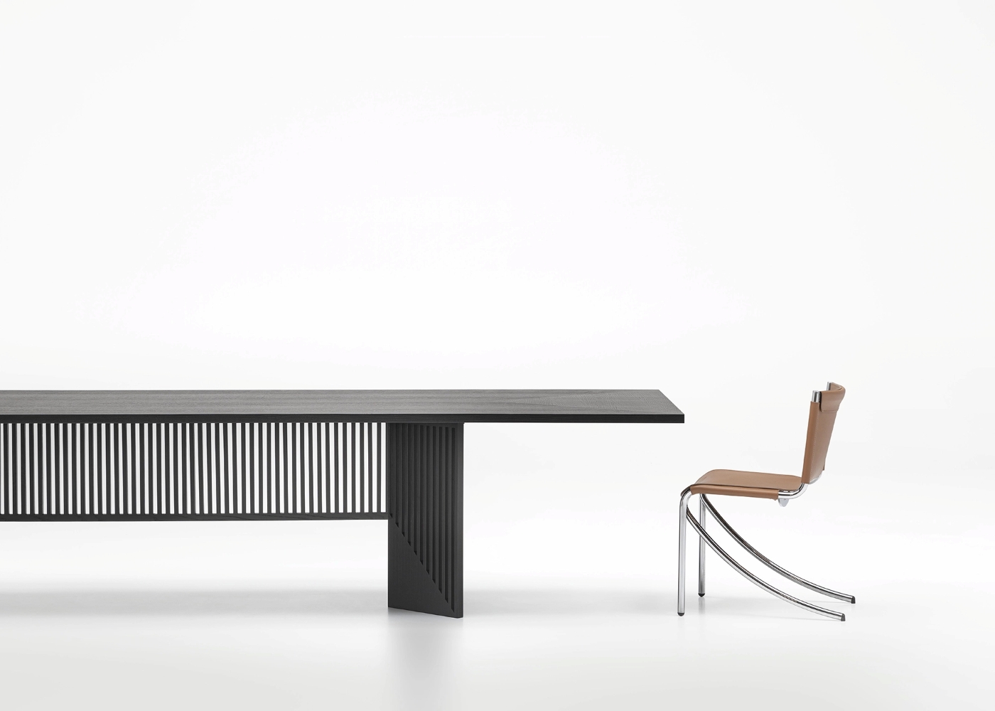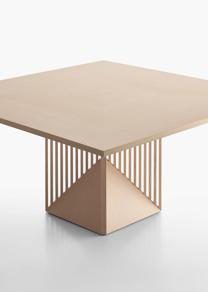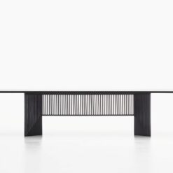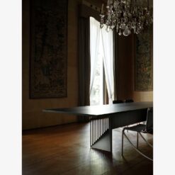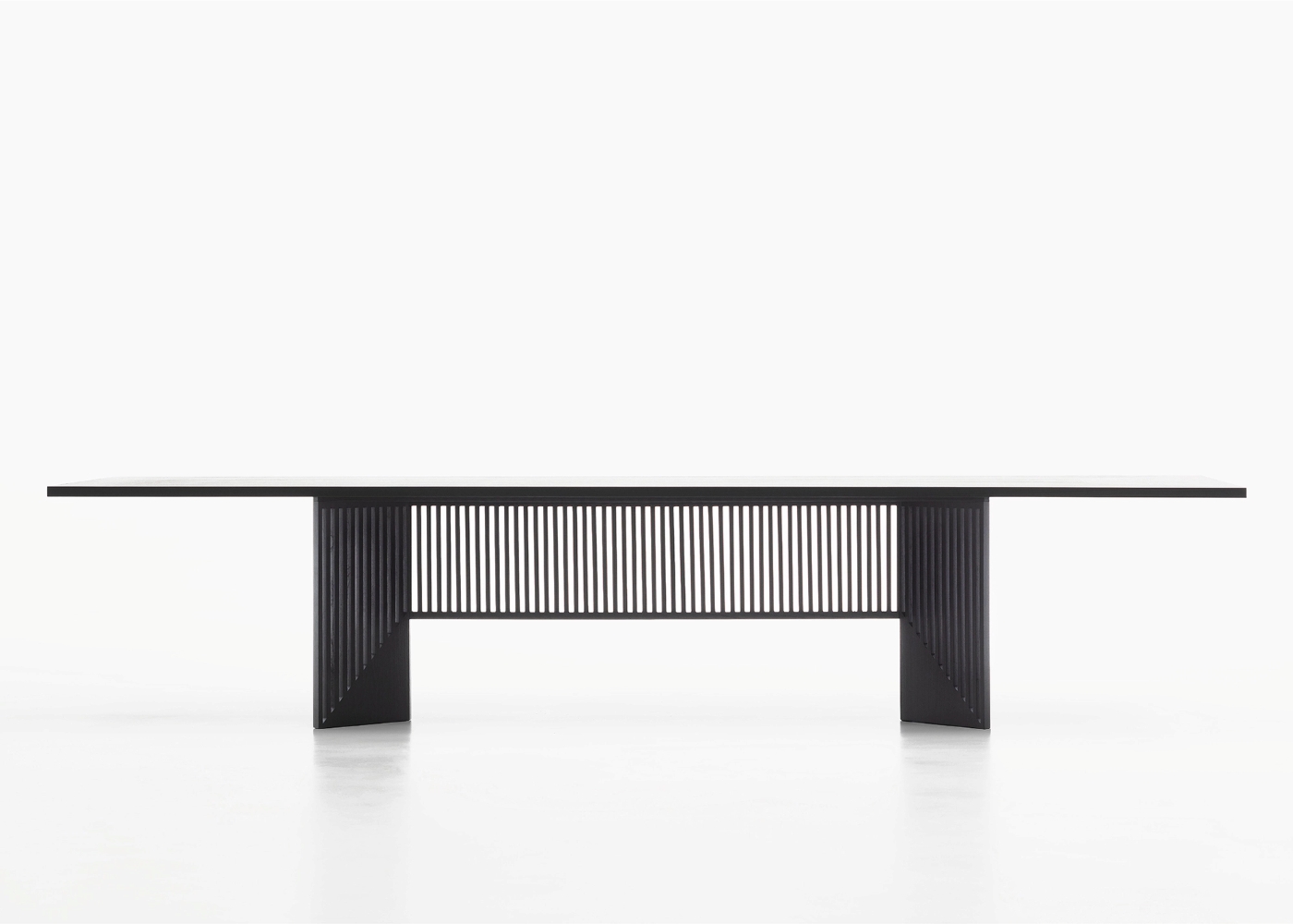 Today, in the new 1.5×1.5 meters square version and in the 2,5, 3 and 3.5 meters rectangular version, it becomes grander in its scale for modern entertaining needs, and more dramatic in its material impact, with black and bleached ash wood and dark stained walnut making dark silhouettes of the long, cantilevered wings of the table and its linear play of cutouts that recalls traditional Japanese architecture.