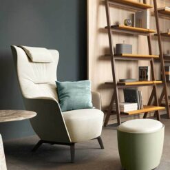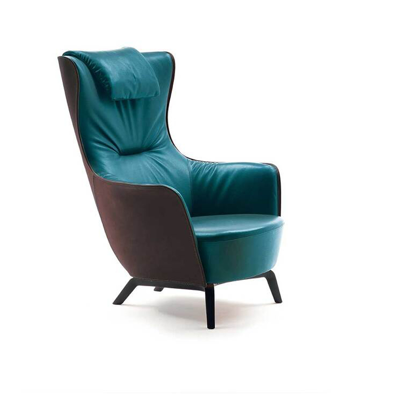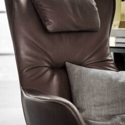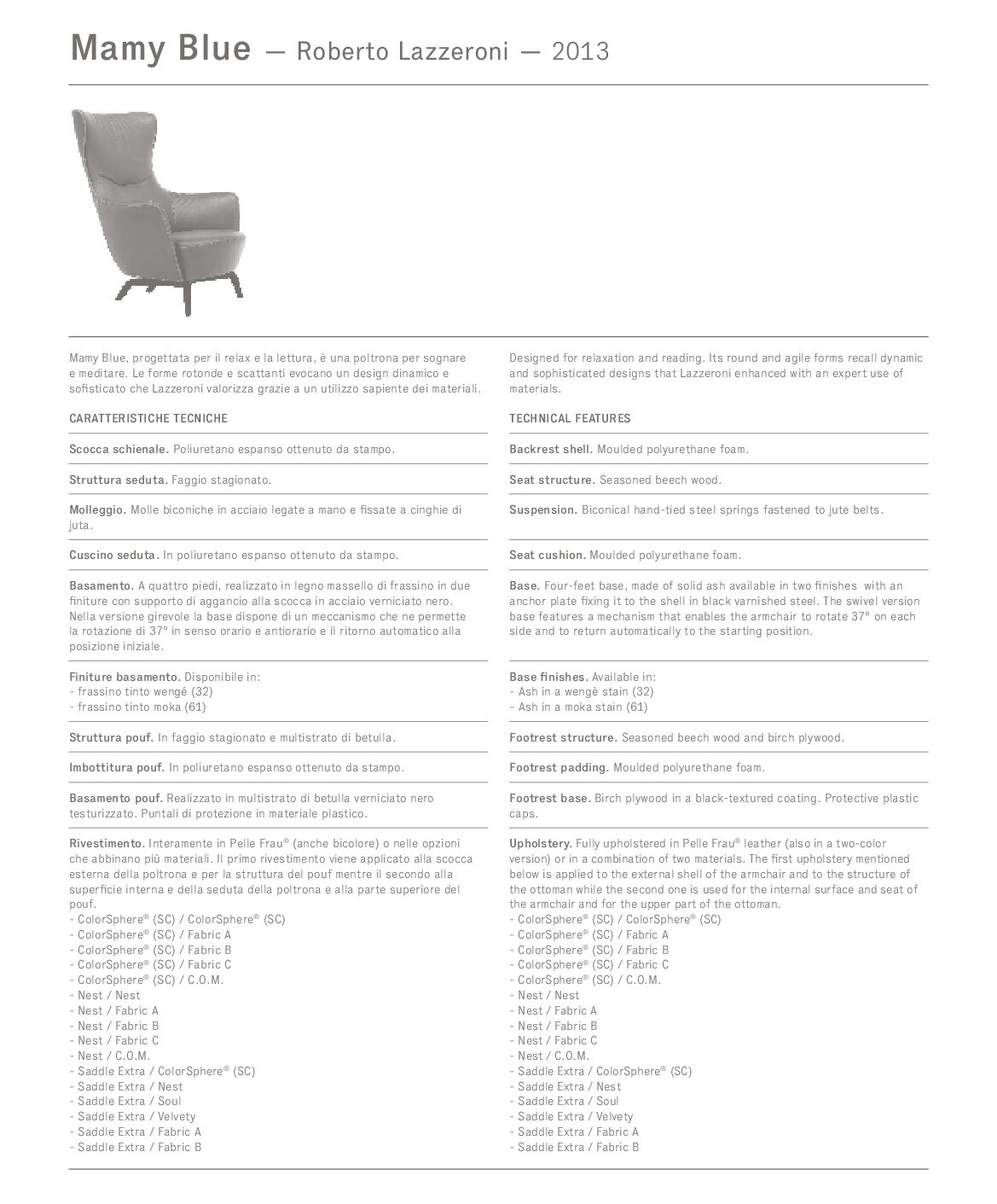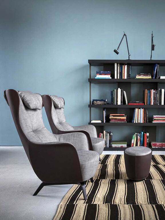 For the Mamy Blue armchair, the backrest structure is in moulded polyurethane foam. The spring system of the seat, in seasoned beechwood, consists of hand-tied steel biconical springs attached to jute belts. It can be upholstered entirely in Pelle Frau® leather or in many other combinations of saddle-leather, leather and fabric. The combination of various materials is enhanced by elegant visible contrast stitching. The soft optional head rest, padded with polyurethane foam and goose down, does not need to be fastened in place but simply placed on the backrest where it can be positioned as desired thanks to the counterbalance inserted internally. Mamy Blue has a 4-foot solid ash base with a wenge or moka stain, also in the swivel armchair version. For the Mamy Blue pouf, the structure is made from seasoned beechwood and birch plywood and upholstered either entirely in Pelle Frau® leather or in Pelle Frau® leather combined with fabric, as with the armchair.