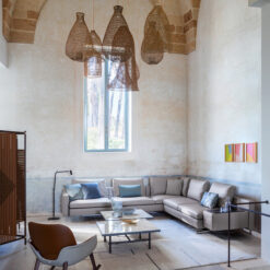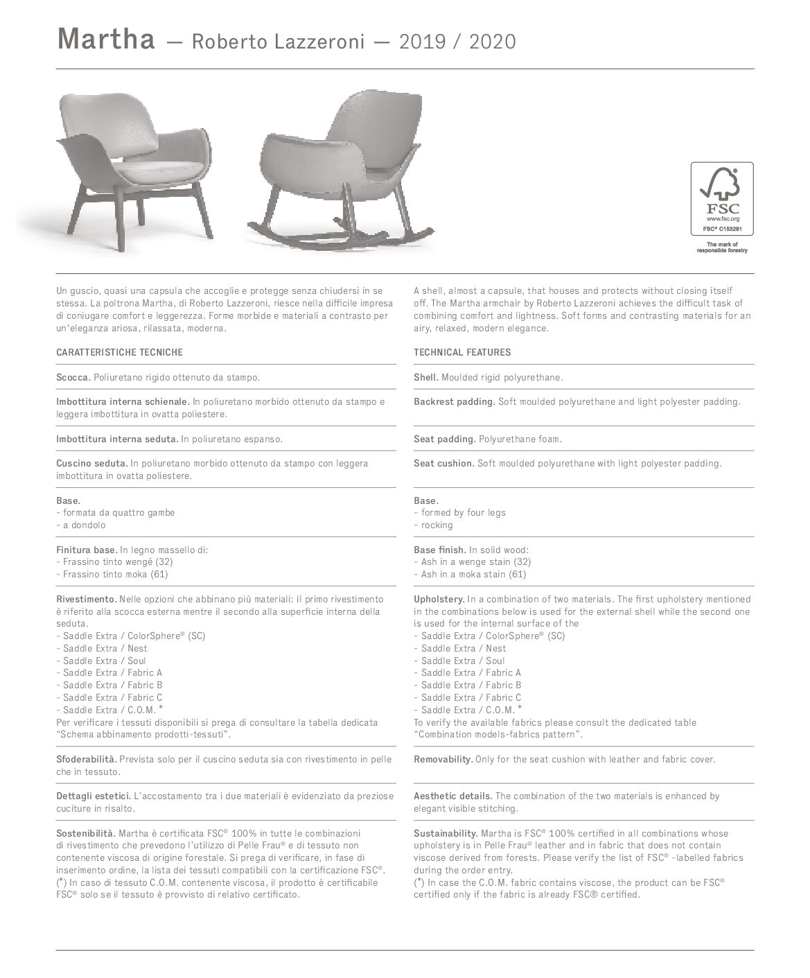 The colour effects and material combinations underline the fluidity and lightness of Martha. The outside of the frame is upholstered with a rich shell of Saddle Extra Leather while the inside can be covered in Pelle Frau® leather or fabric. The combination of the two materials is emphasised by the elegant visible contrast stitching carried out by hand. A soft seat cushion with removable cover in Pelle Frau® leather or fabric completes the product.