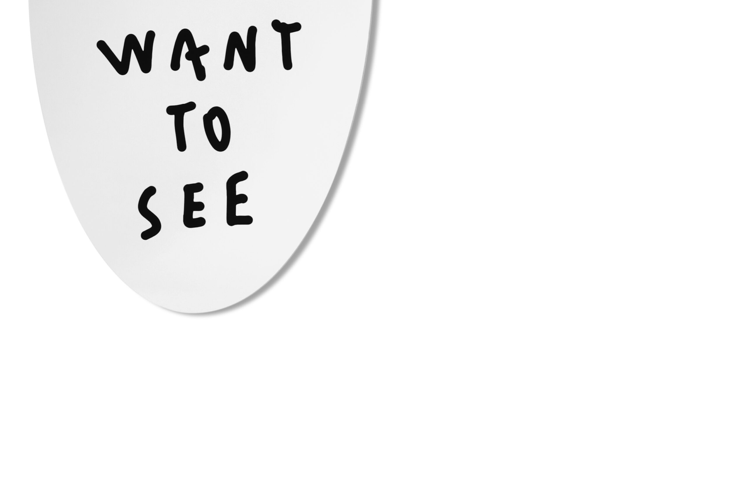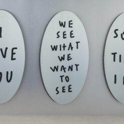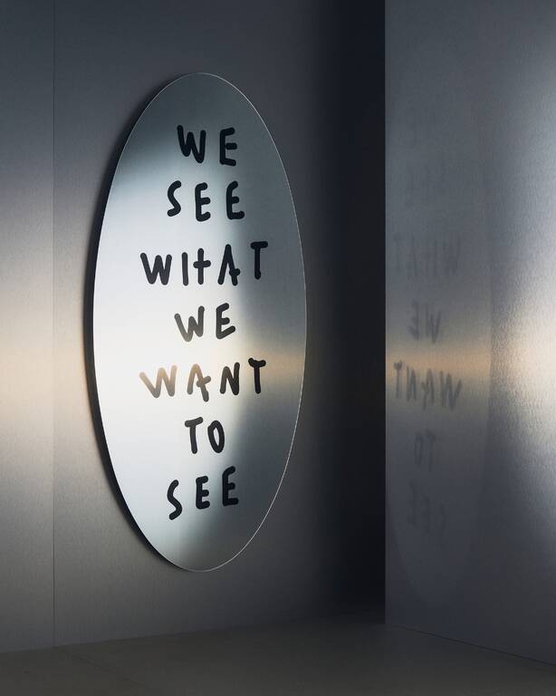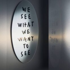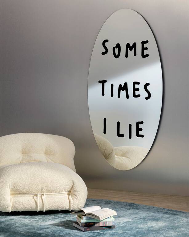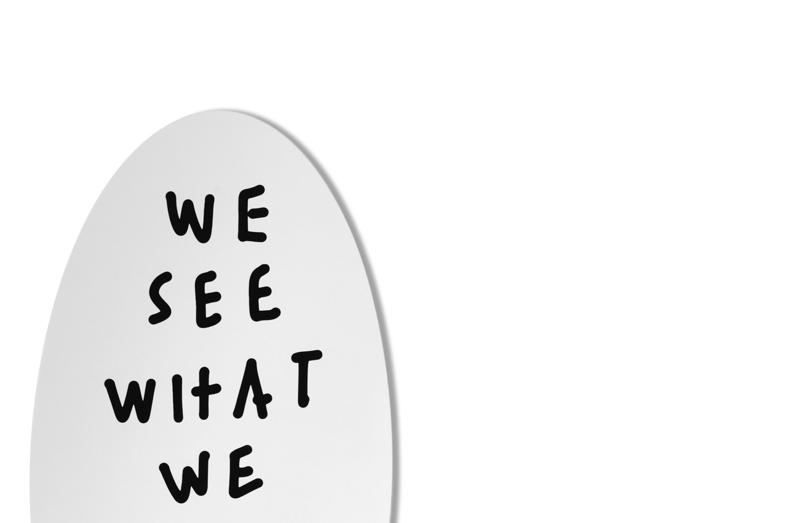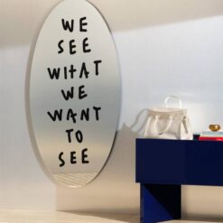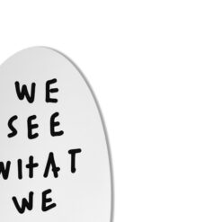 Featuring a contemporary design aesthetic, the large oval ME FROM OUTSIDE mirror contains a screen-printed message, in capital letters, that creates a candid relationship between the observer and the object itself. This version, which becomes part of the Details collection, bears the phrase “We see what we want to see”, emphasising how perception of the world is altered by the sensitivities of each individual.