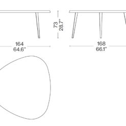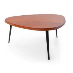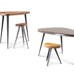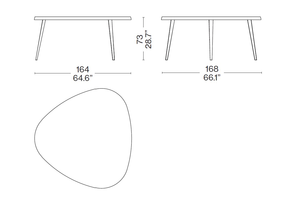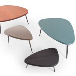 Included among the en forme libre tables developed between 1938 and 1939, the final project was conceived in 1952 for the student rooms of the Maison du Mexique at the Cité Universitaire Internationale in Paris. The structure designed to take up as little space as possible provided for the possibility of placing several pieces side by side to create compositions with a wider and more regular shape. In 1952 the author replaced the wooden legs with triangular section legs in folded sheet metal. In 1956 a low version was made for the Galerie Steph Simon in Paris. The high thickness of the wooden top, available both in solid wood and in glossy or matt lacquer, conveys remarkable beauty, while the edges reveal a profile that is functional to the shape and size of the hand. In 2018, two new dining variants are added that allow you to accommodate 5 or 6 diners. New finishes have also been introduced which further increase the combinability and functionality of the tables.