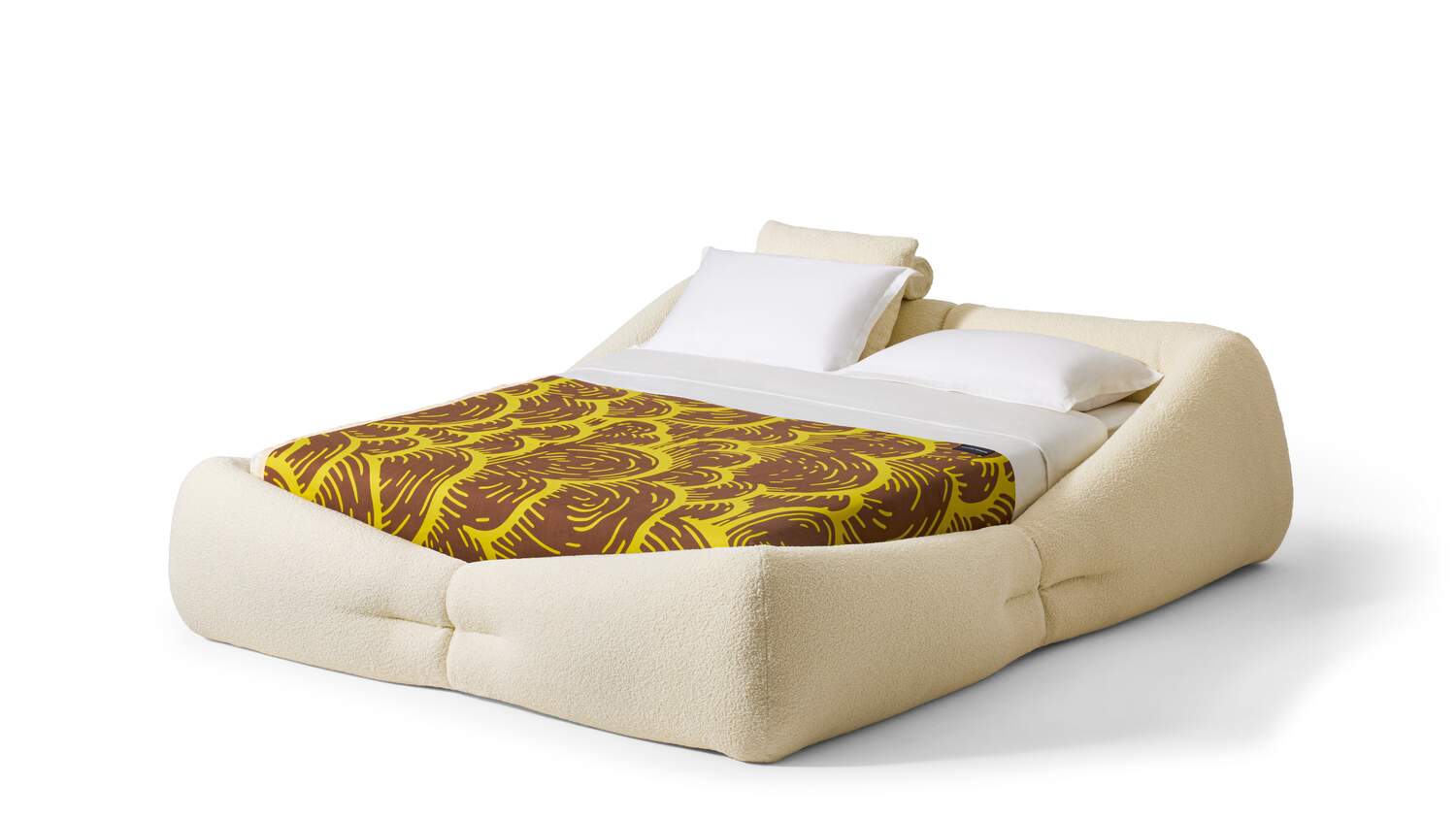 Patricia Urquiola continues her exploration of an innovative concept for upholstered furniture, based on the use of sustainable materials and characterised by generous proportions and welcoming shapes. Mon-Nid is an island of comfort distinguished by delicate lines and exposed stitching carried over from the namesake sofa. The recycled PET fibre in the padding, with its extraordinary softness, makes this a voluminous, fluffy bed completely free of polyurethane. Since there are no glued parts, the product can be completely disassembled at the end of its life cycle.